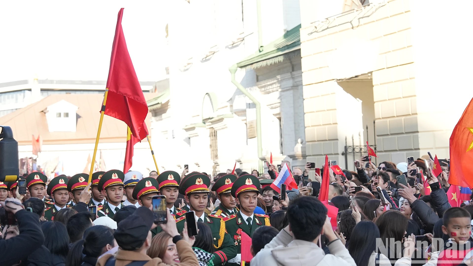| Các chiến sĩ nở nụ cười rạng rỡ khi gặp bà con người Việt Nam tại Moskva, đồng thời trao những cái bắt tay tình cảm, ấm áp, thắm tình quân dân. |