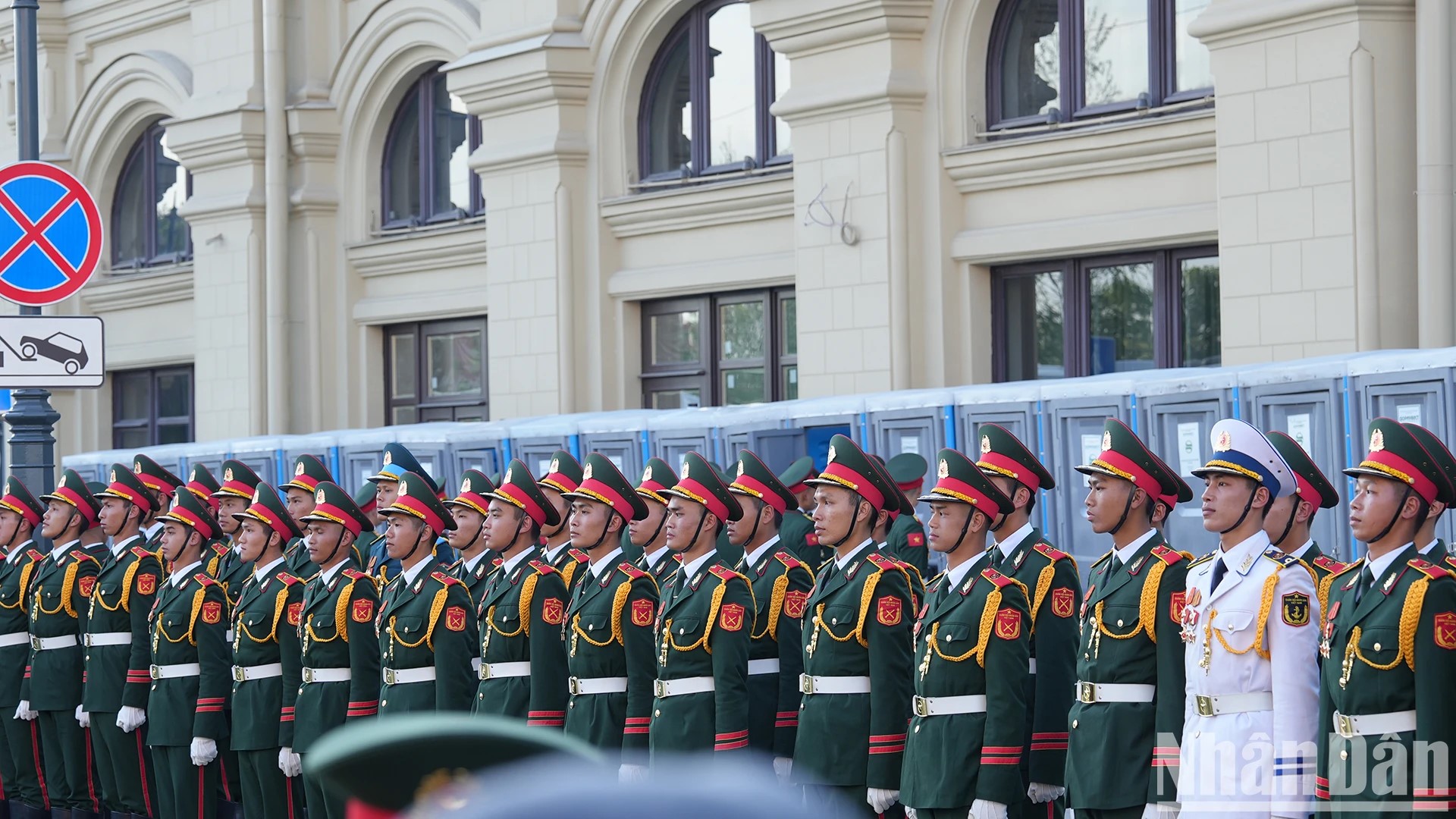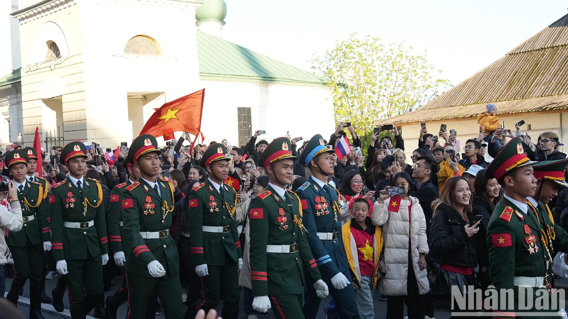 | Người dân chào đón, tán dương khối quân nhân Quân đội nhân dân Việt Nam tham gia hợp luyện chuẩn bị cho Lễ duyệt binh ngày 9/5 khi họ đi ngang qua. Đoàn nhận nhiều chú ý với đội hình đồng đều cao từ 1m80 trở lên, thể hình cân đối, tác phong nghiêm nghị. |