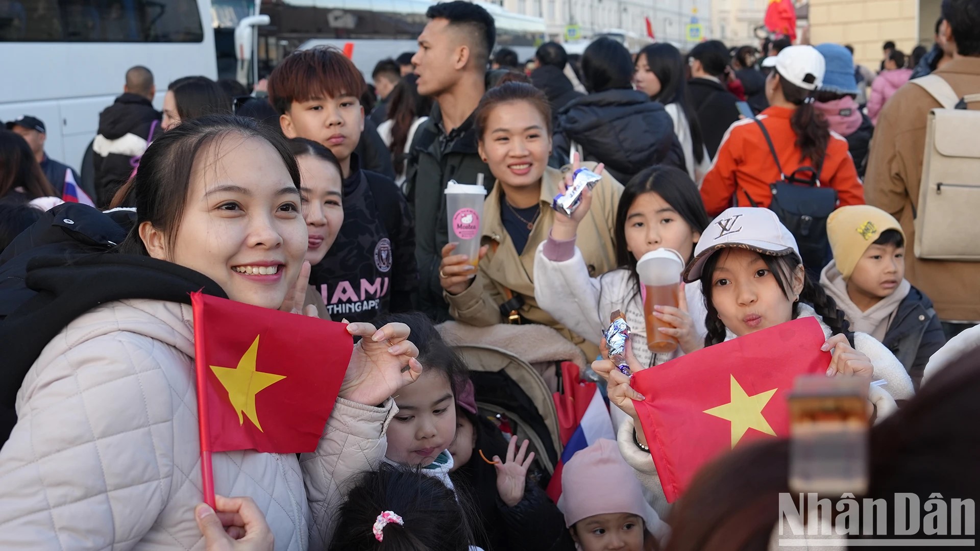 | Nhiều người dân Việt Nam mang theo hoa tươi, ảnh Bác Hồ, cờ Tổ quốc và cờ Nga, tạo nên hình ảnh đẹp, xúc động. |