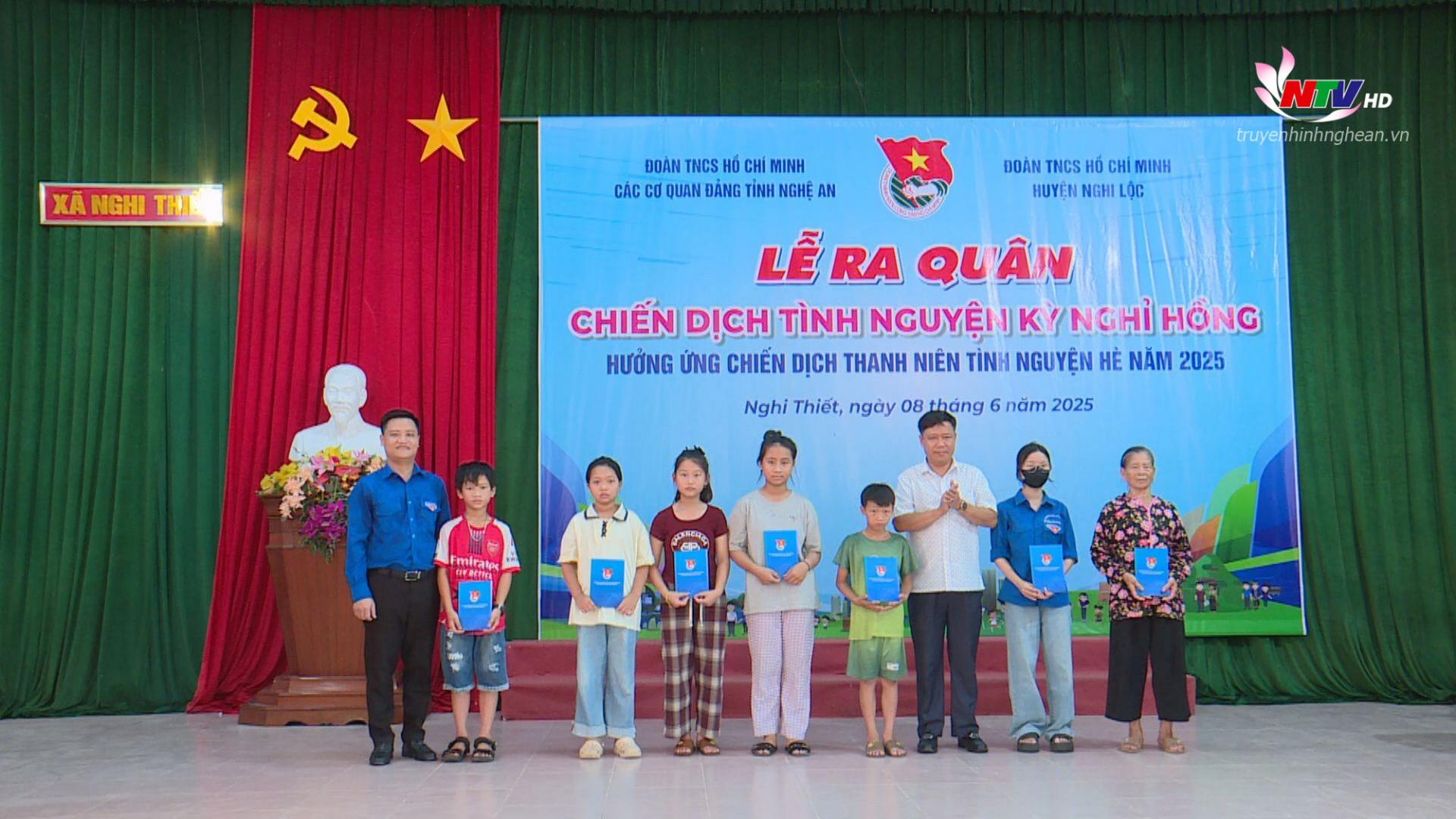 Tại buổi lễ, ban tổ chức cũng đã trao tặng 10 suất quà cho học sinh có hoàn cảnh khó khăn trên địa bàn xã Nghi Thiết, đồng thời trao tặng nhiều phần quà và công trình ý nghĩa như: 100 lá cờ Tổ quốc cho ngư dân địa phương, thuốc và vật tư y tế cho Trung tâm Y tế xã, công trình “Nước sạch cho em” tại Trường Tiểu học Nghi Thiết.