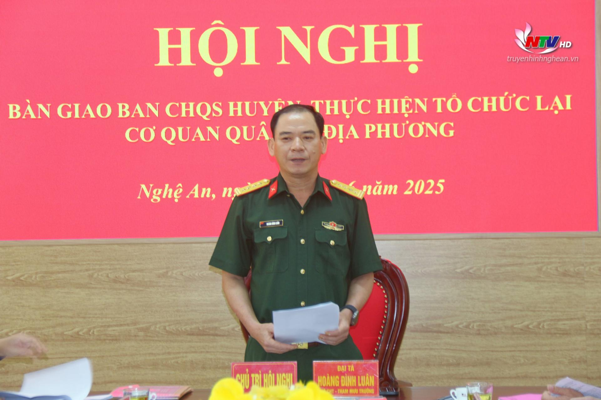 Phát biểu kết luận hội nghị, Đại tá Hoàng Đình Luân – Phó Chỉ huy trưởng, Tham mưu trưởng Bộ Chỉ huy Quân sự ghi nhận, biểu dương tinh thần trách nhiệm và sự phối hợp chặt chẽ giữa Ban Chỉ huy Quân sự các huyện Yên Thành, Diễn Châu, Quỳnh Lưu, Thị xã Hoàng Mai và Ban Chỉ huy Phòng Thủ khu vực 2 - Quỳnh Lưu trong quá trình triển khai công tác bàn giao. Đồng chí Tham mưu trưởng Bộ Chỉ huy Quân sự tỉnh đánh giá cao việc các đơn vị thực hiện nghiêm túc, đúng quy trình, kế hoạch đã được phê duyệt; bảo đảm tính đồng bộ, hiệu quả trên các mặt công tác.