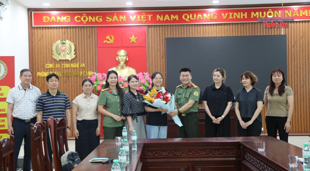 | Công an Nghệ An tiếp đón chu đáo, tặng hoa những người nước ngoài đến làm làm thủ tục cấp tài khoản định danh điện tử mức độ 2. |