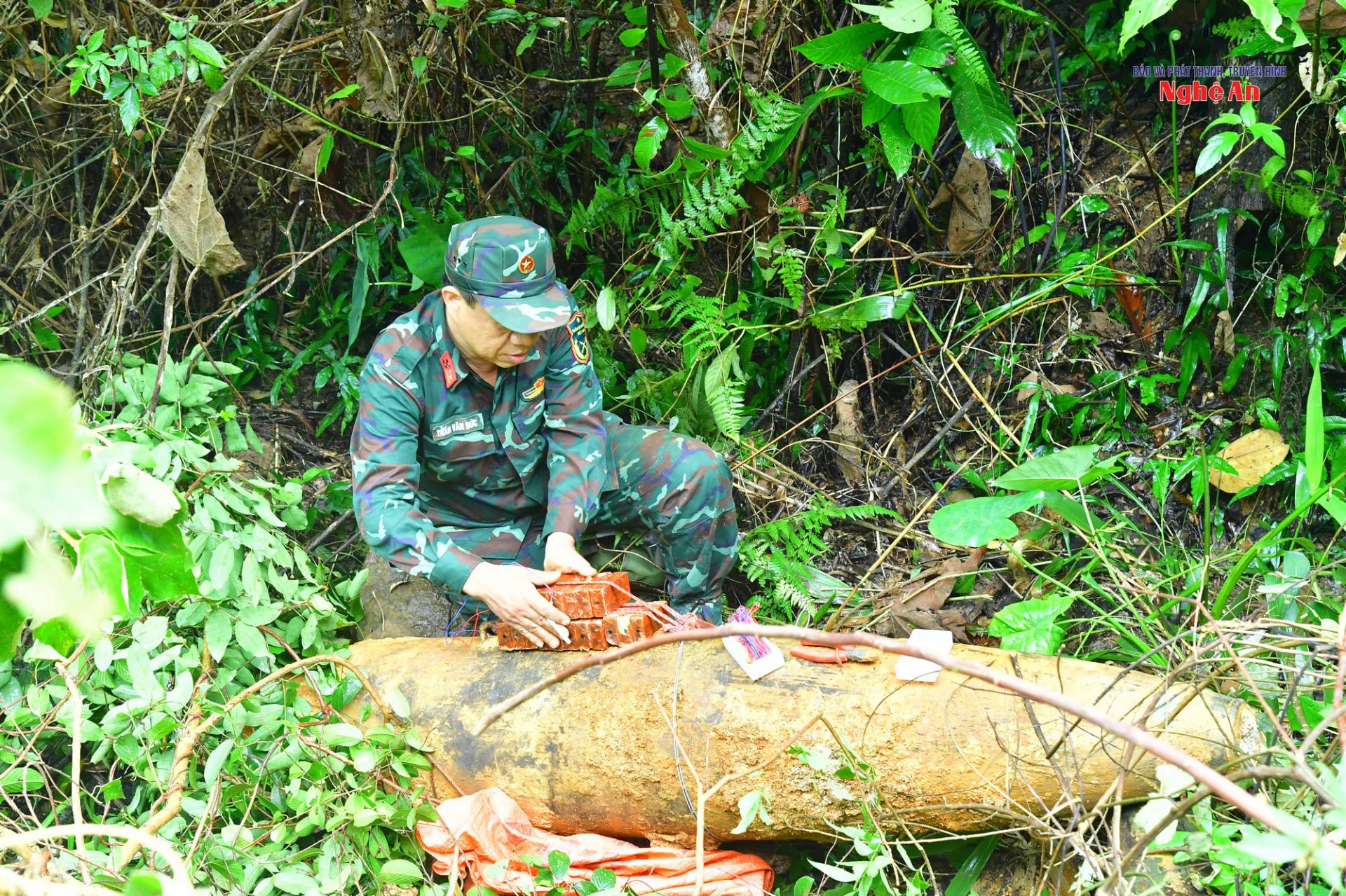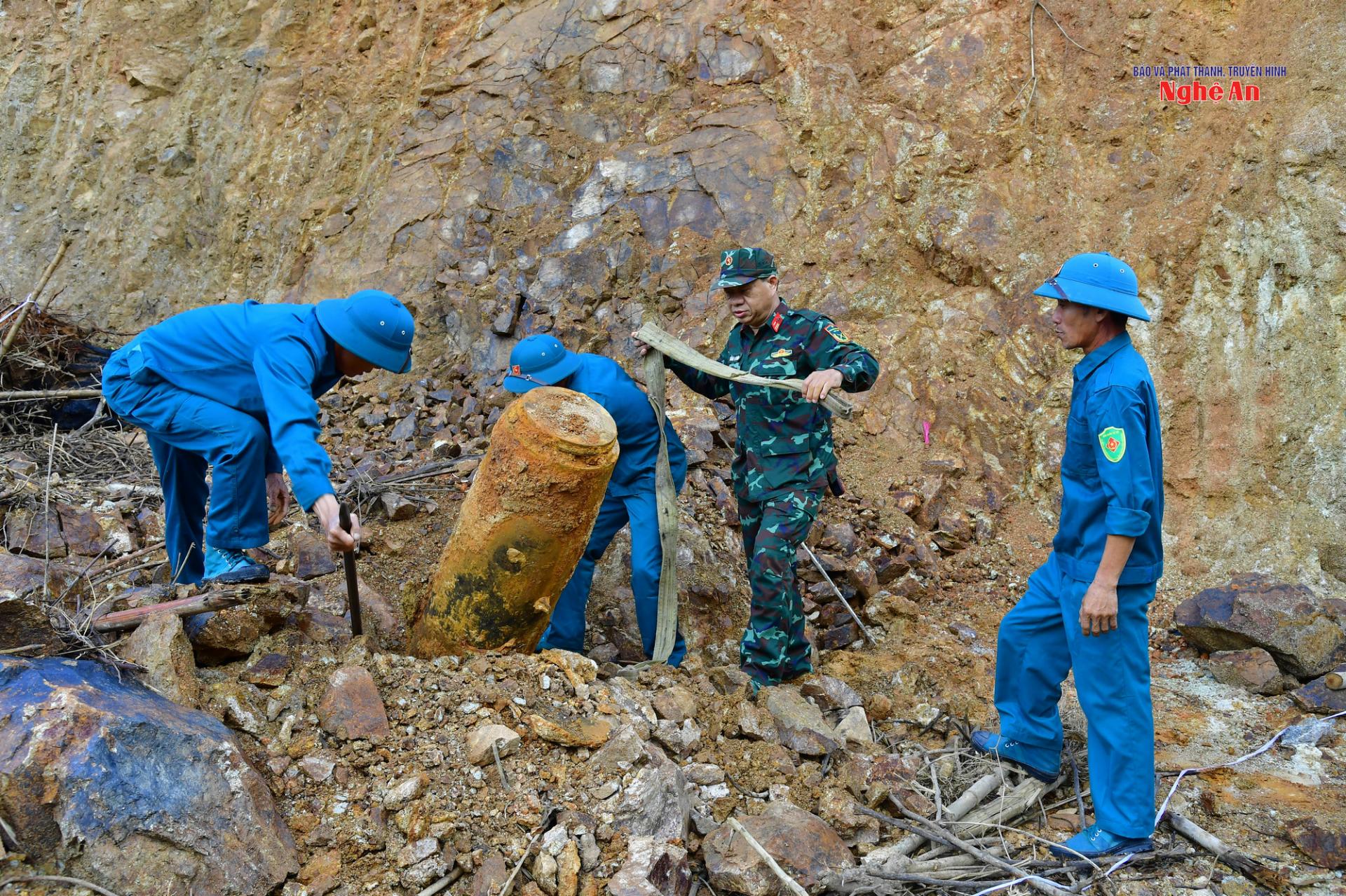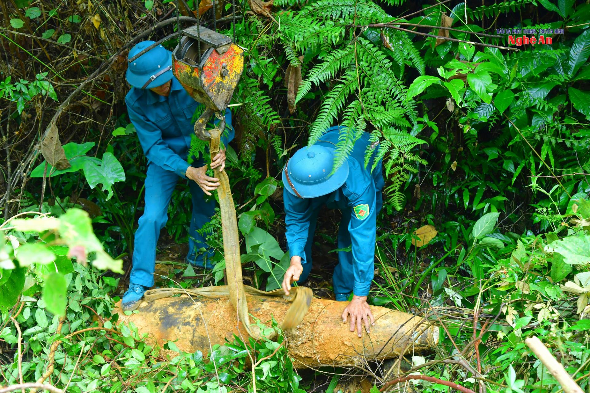 | Lực lượng Dân quân Ban Chỉ huy Quân sự xã Thần Lĩnh di chuyển quả bom đến Khe Luội, xóm 8, xã Thần Lĩnh, tỉnh Nghệ An tiến hành tiêu huỷ |