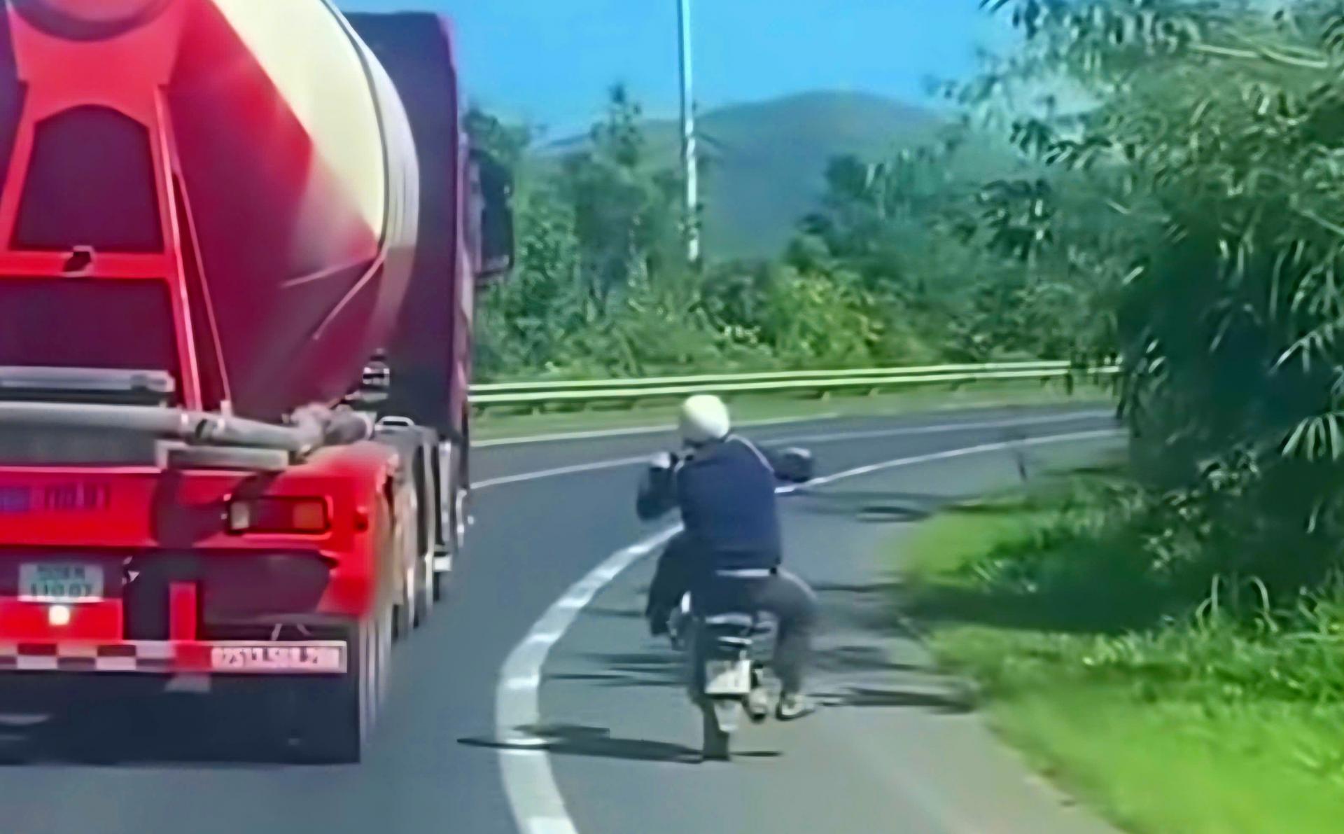 | Vừa bốc đầu xe, thanh niên này vừa chạy sát vào xe bồn ở khúc quanh để so kè vô cùng nguy hiểm. |