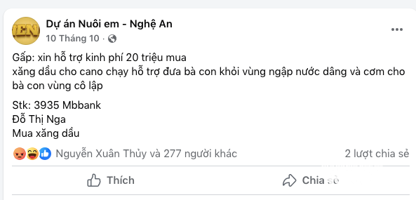 | Một status xin hỗ trợ kinh phí mua xăng dầu được đăng tải trên fanpa "Dự án nuôi em - Nghệ An". Ảnh: Chụp lại màn hình |