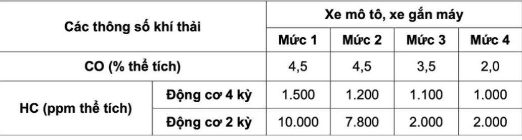Quy chuẩn bao gồm 4 mức giá trị giới hạn tối đa cho phép đối với từng thông số Hydrocacbon (HC), Cacbon Monoxit (CO) trong khí thải xe mô tô, xe gắn máy tham gia giao thông đường bộ.