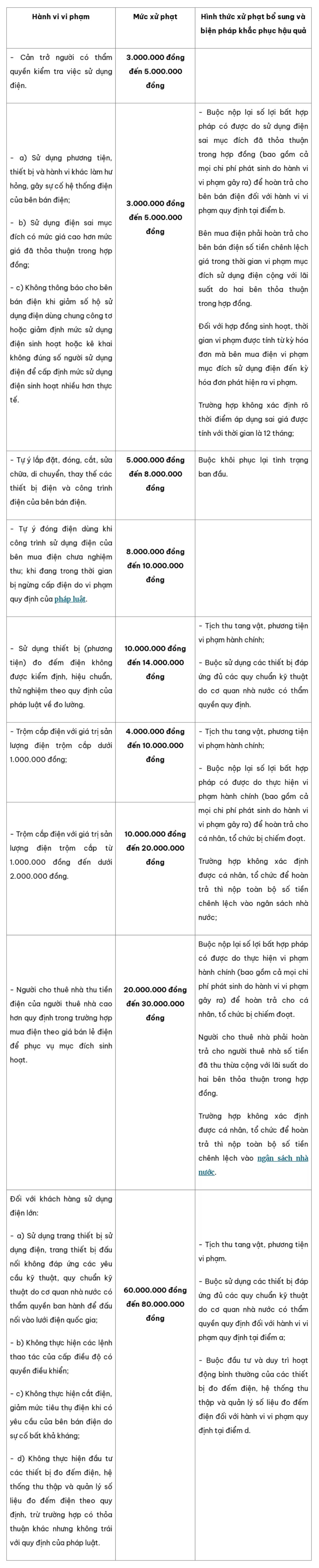 Ngoài hành vi này, Điều 13 Nghị định số 133/2026/NĐ-CP cũng quy định mức xử phạt vi phạm hành chính, biện pháp khắc phục hậu quả với các hành vi vi phạm quy định về sử dụng điện khác như sau: