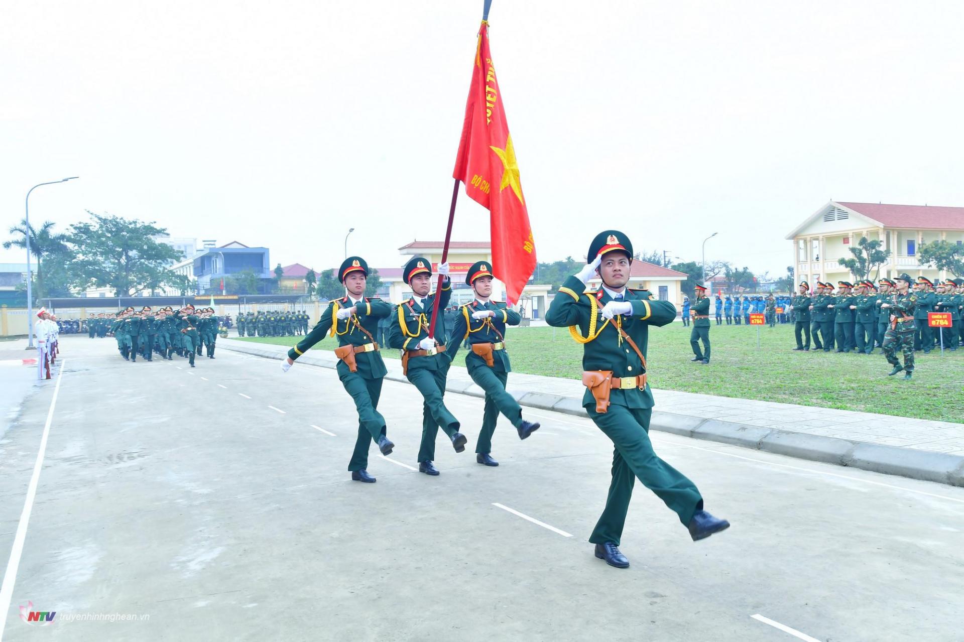 | Đi đầu đội hình là Tổ Quân kỳ với lá cờ "Quyết thắng". |