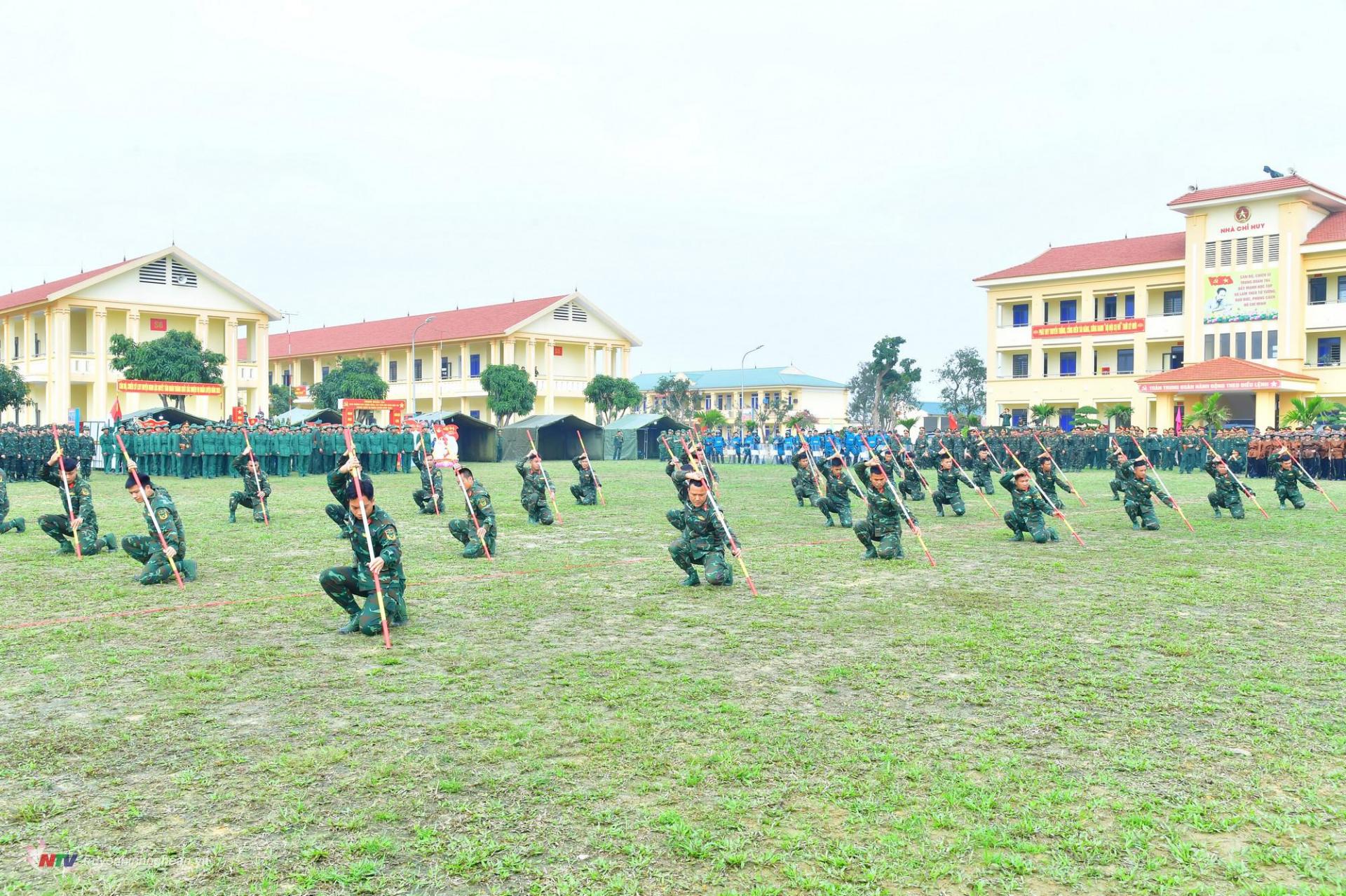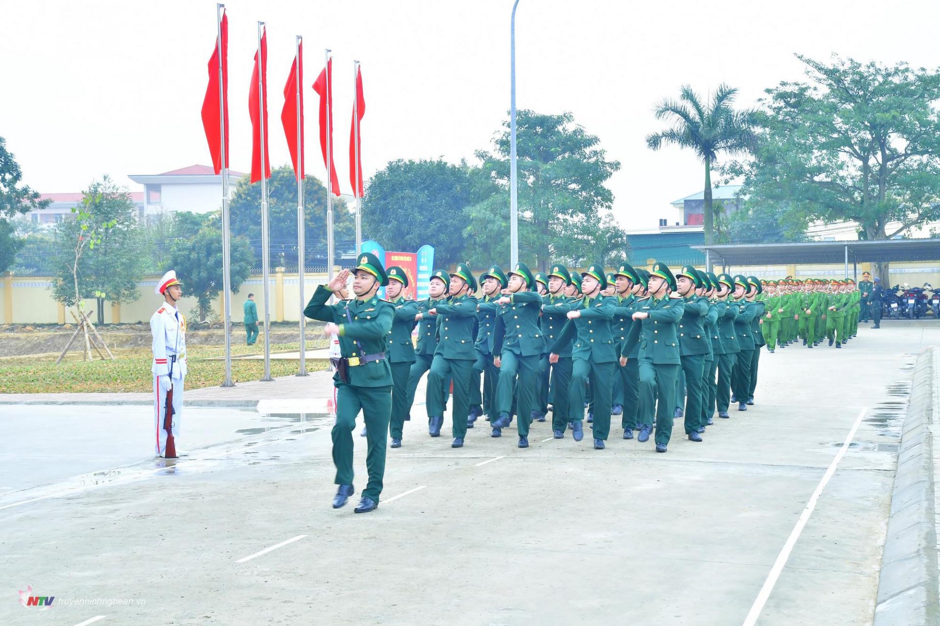 | Khối lực lượng Dân quân tự vệ huyện Hưng Nguyên tham gia buổi tổng duyệt cho lễ ra quân huấn luyện. |