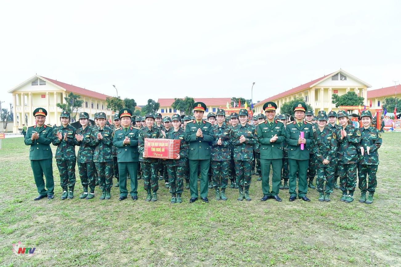 | Đại tá Đinh Bạt Văn – Phó Chỉ huy trưởng, Tham mưu trưởng Bộ Chỉ huy Quân sự tỉnh cùng các đồng chí trong đoàn công tác tằng quà động viên lực lượng sinh viên trường Đại học Vinh tham gia phầm múa dân vũ trong lễ tổng duyệt ra quân huấn luyện. |