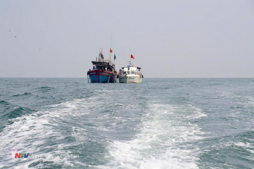 | Phương tiện tuần tra của Bộ đội Biên phòng tỉnh Nghệ An kiểm tra phương tiện ngư dân đang hoạt động trên biển. |