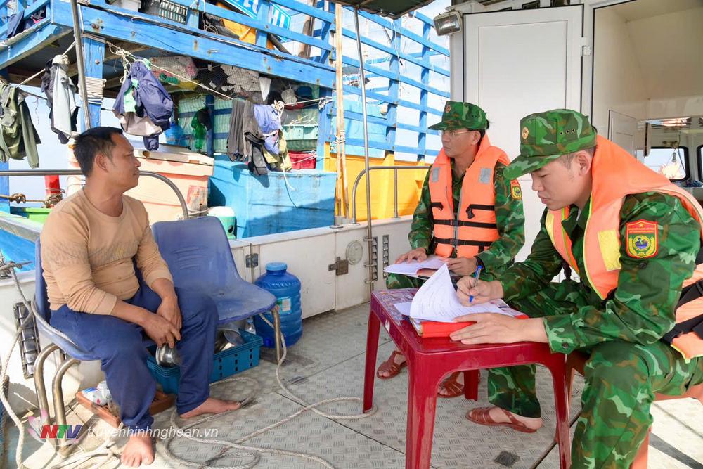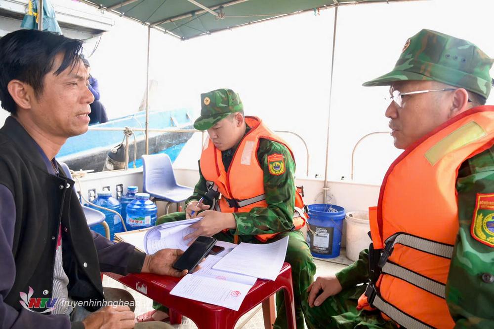 | Đại tá Hồ Quyết Thắng (người ở giữa), Phó Chỉ huy trưởng, Tham mưu trưởng Bộ đội Biên phòng tỉnh Nghệ An trực tiếp kiểm tra giấy tờ của ngư dân hành nghề khai thác thủy sản trên biển. |