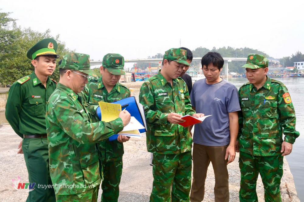 | Đoàn công tác Bộ Chỉ huy Bộ đội Biên phòng tỉnh Nghệ An kiểm tra các loại giấy tờ của phương tiện chuẩn bị ra khơi tại cửa Lạch Quèn, huyện Quỳnh Lưu. |