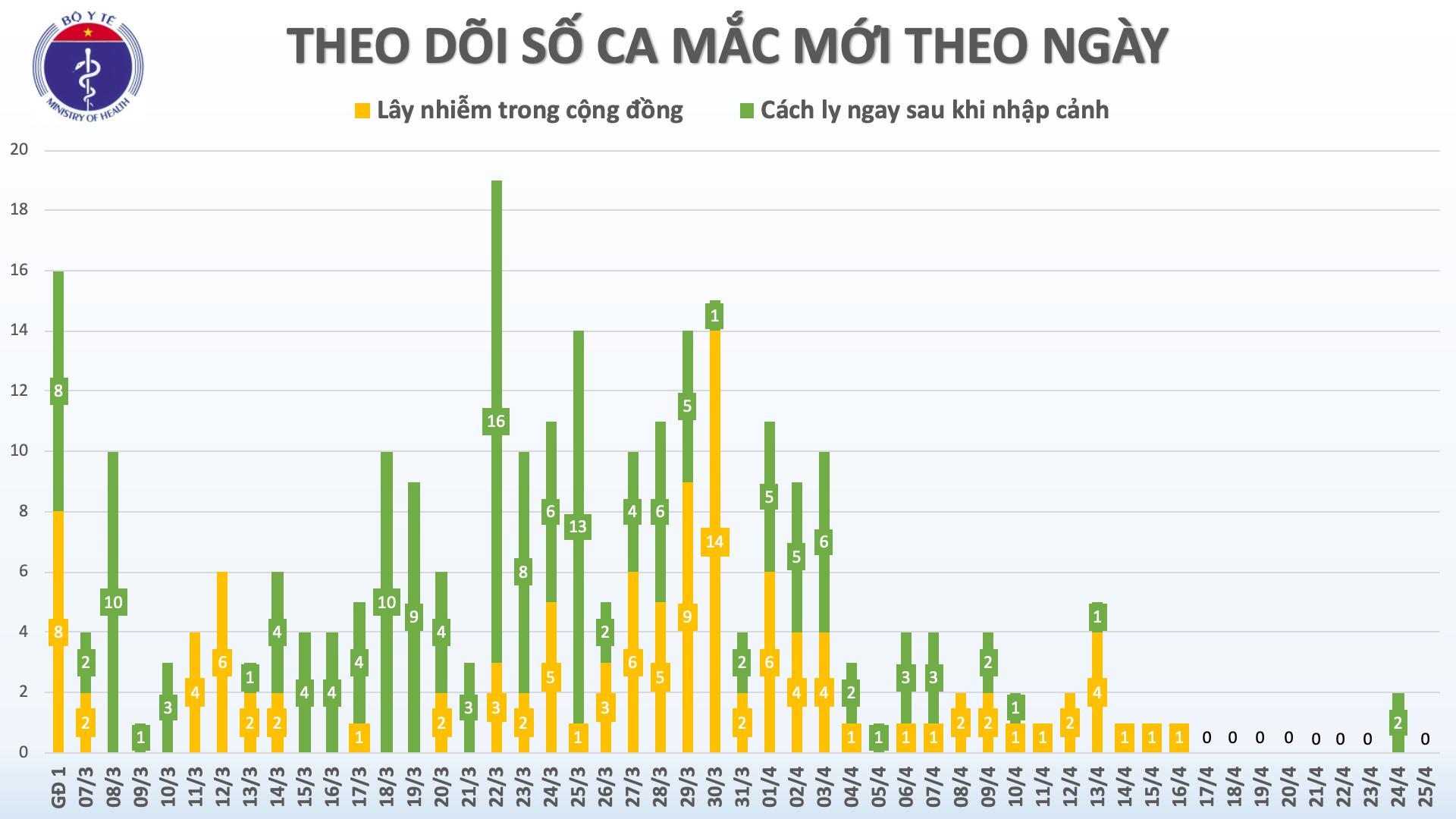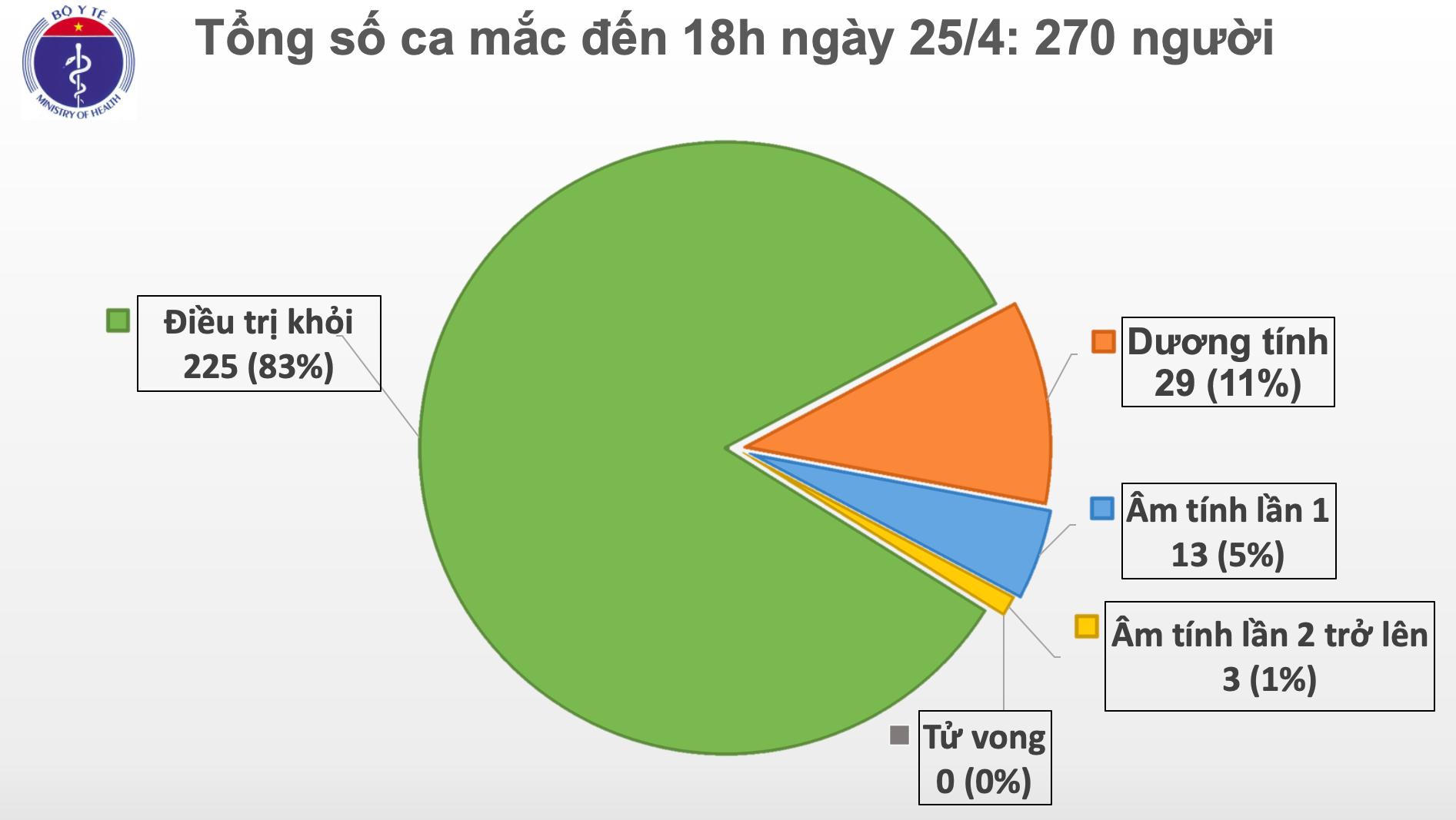 - Tính từ 6h00 đến 18h00 ngày 25/4/2020: 0 ca mắc mới trong cộng đồng.