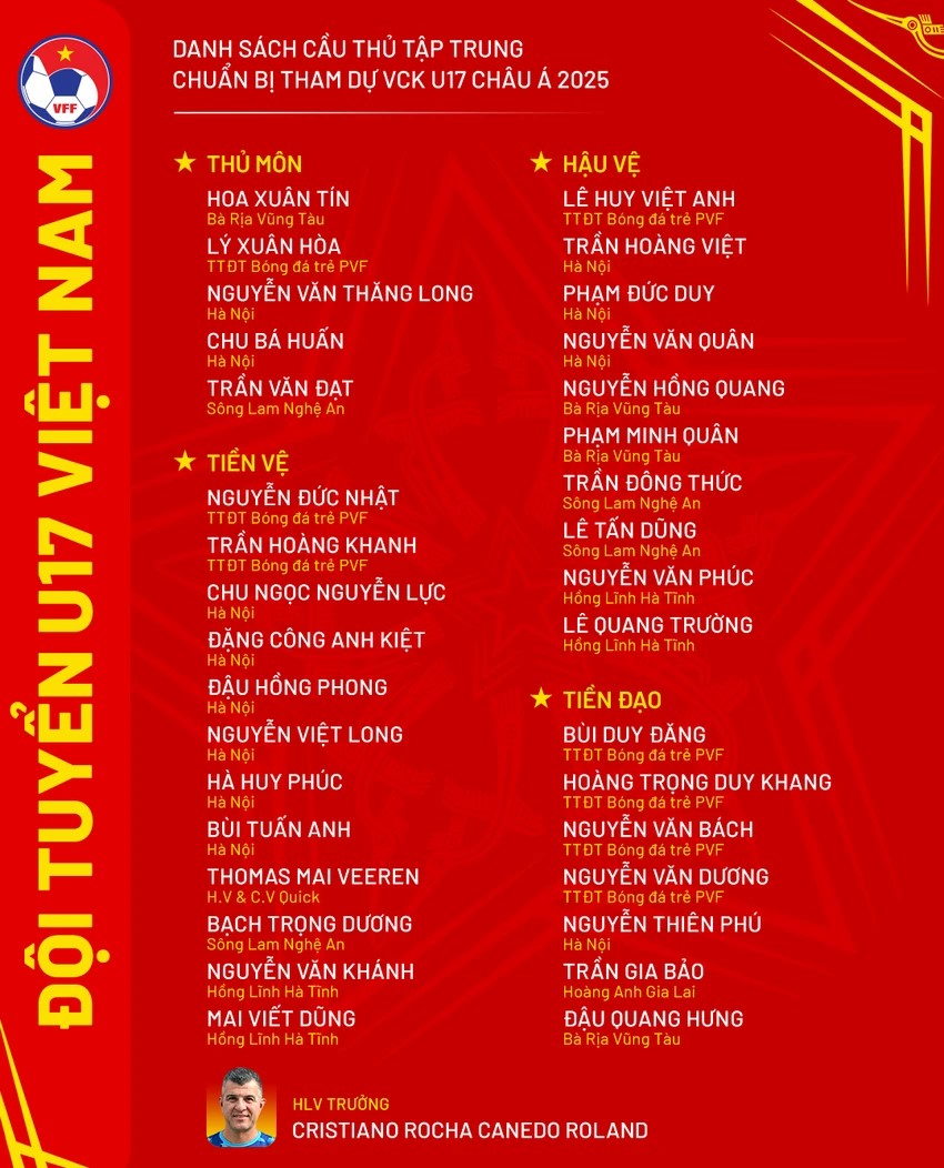 Lực lượng nòng cốt của U-17 Việt Nam vẫn là những cầu thủ đã chinh chiến tại vòng loại U-17 châu Á 2025, cùng với những gương mặt quen thuộc trong các đợt tập trung trước đây. Theo VFF, để gia tăng tính cạnh tranh cũng như tạo chiều sâu đội hình, HLV Cristiano Roland đã quyết định bổ sung thêm nhiều nhân tố mới. Điều này không chỉ giúp đội tuyển có thêm lựa chọn về chiến thuật mà còn mang đến động lực để các cầu thủ thể hiện khả năng, qua đó tìm kiếm suất tham dự giải đấu quan trọng sắp tới.