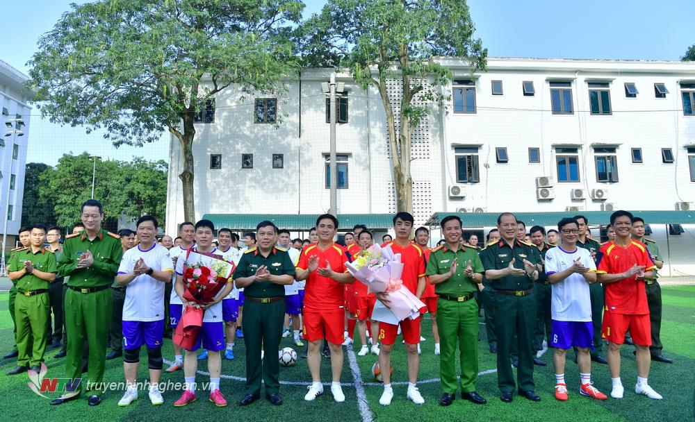 | Lãnh đạo cơ quan Công an tỉnh và Bộ Chỉ huy Quân sự tỉnh tặng hoa động viên các cầu thủ 2 đội trước trận đấu. |