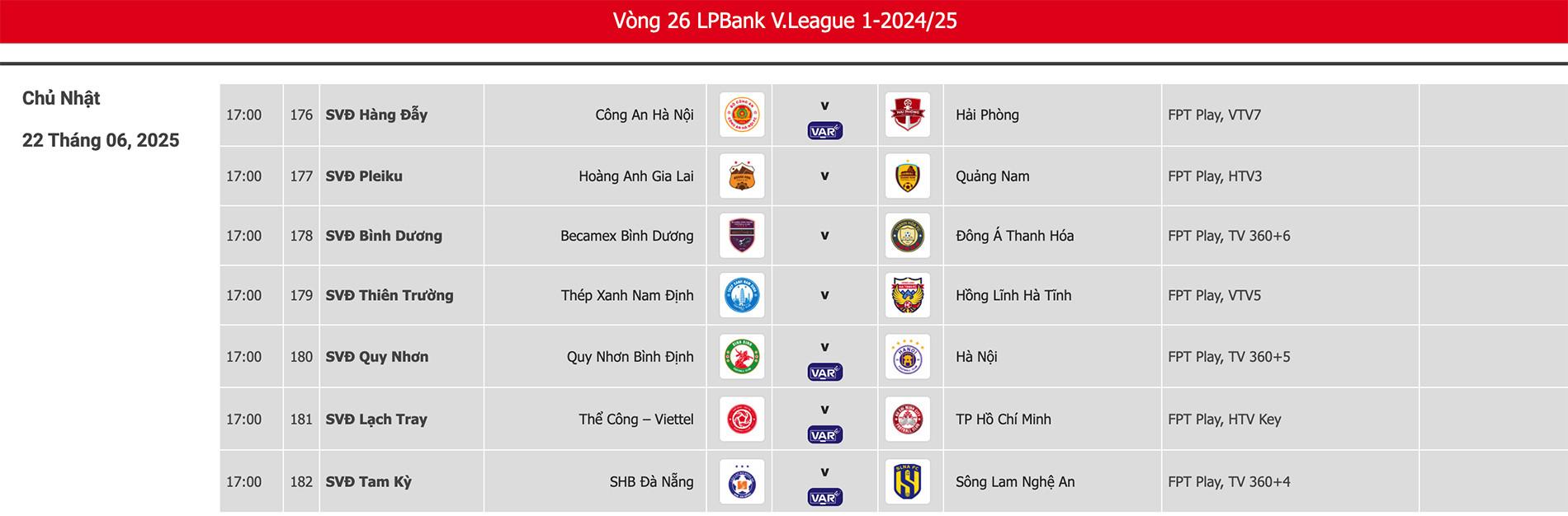 17h hôm nay (22/6), đồng loạt trên 7 sân cỏ cả nước, diễn ra vòng cuối LPBank V-League 2024/25, với tâm điểm là cuộc đua trụ hạng.