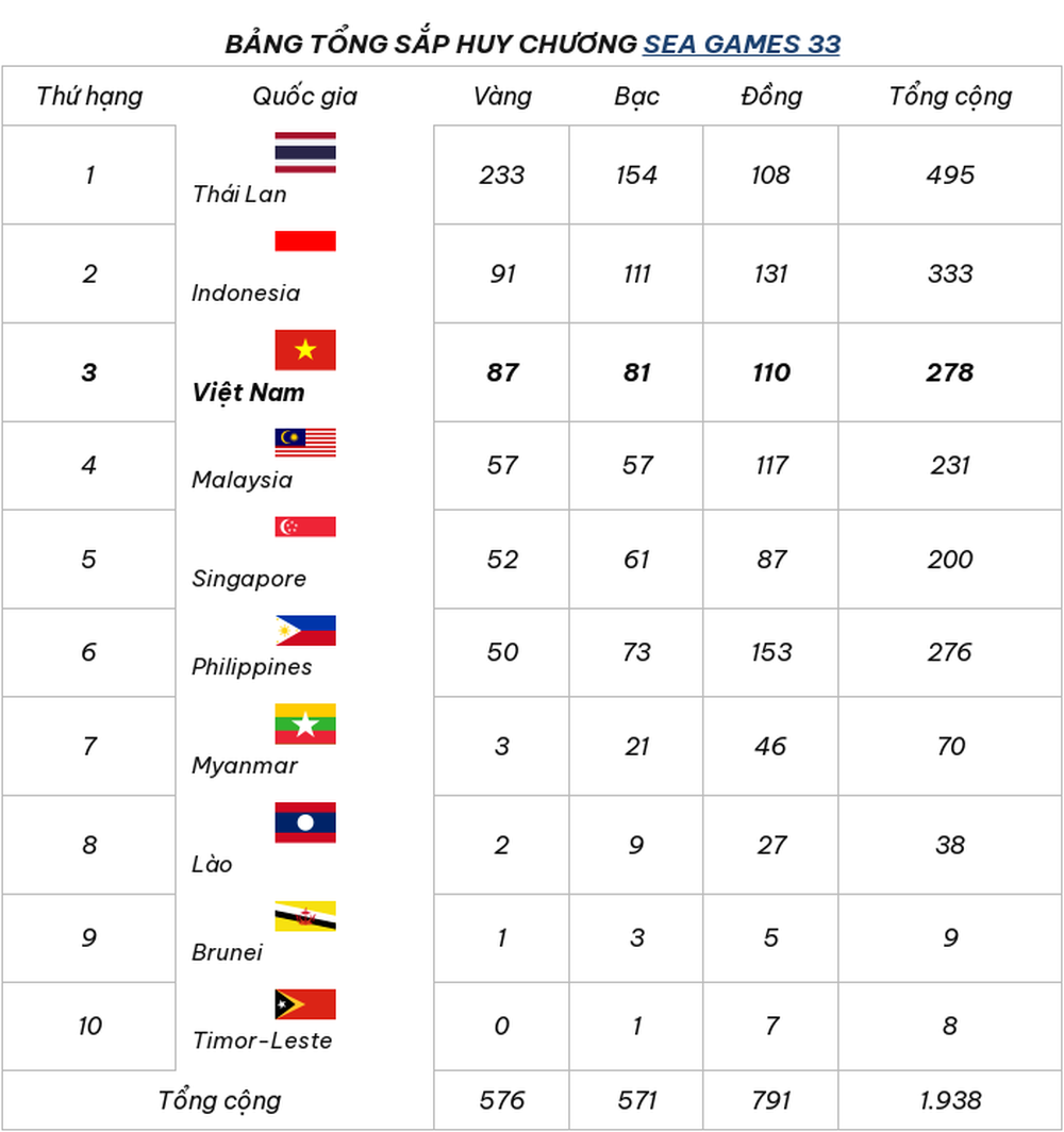 BẢNG TỔNG SẮP HUY CHƯƠNG SEA GAMES 33: