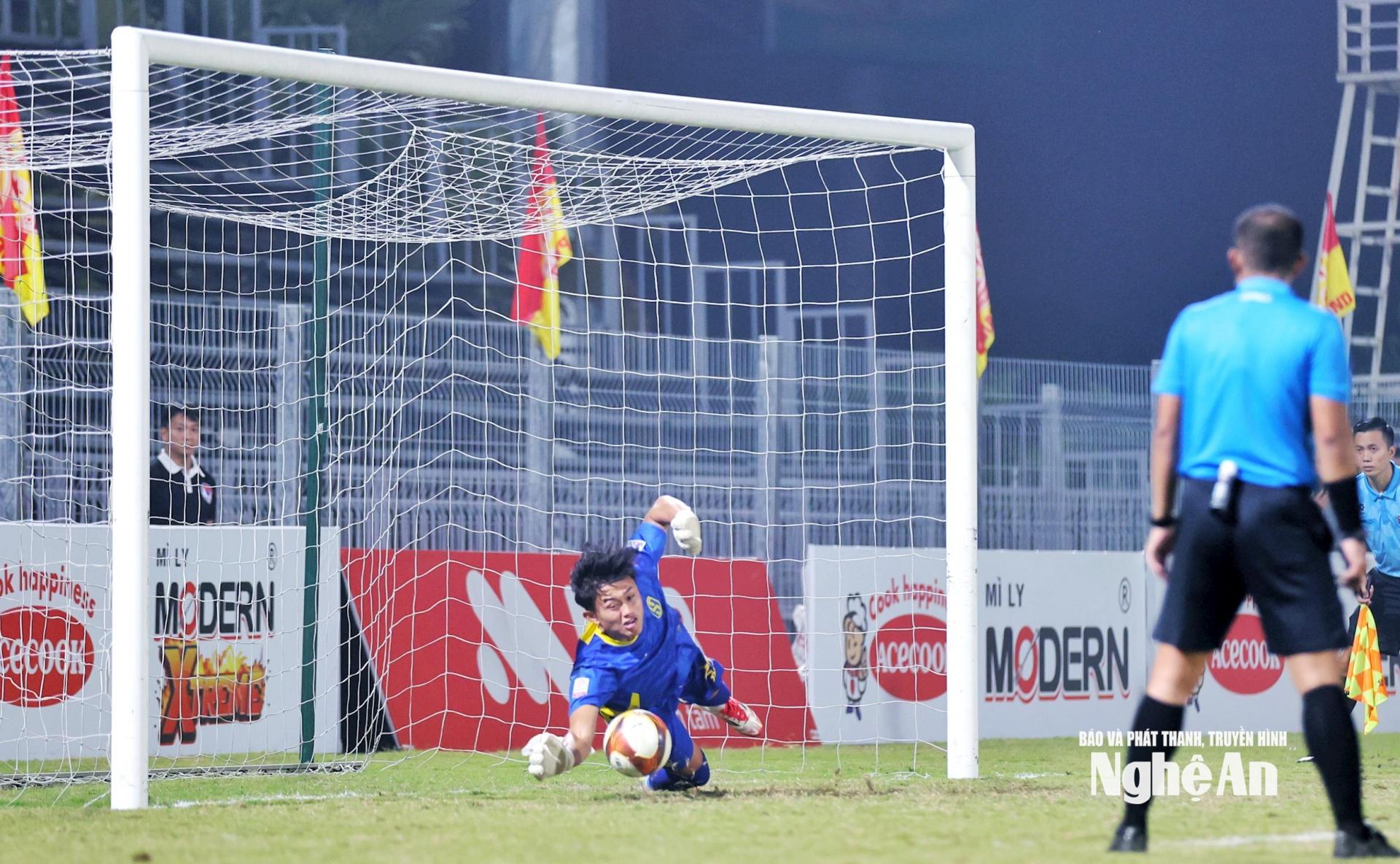 | Thủ môn Bảo Ngọc được xem là người hùng của trận chung kết. Pha đổ người chính xác của anh là bước ngoặt lịch sử đưa U19 SLNA chạm tay vào ngôi vô địch. Ảnh: Đức Anh |