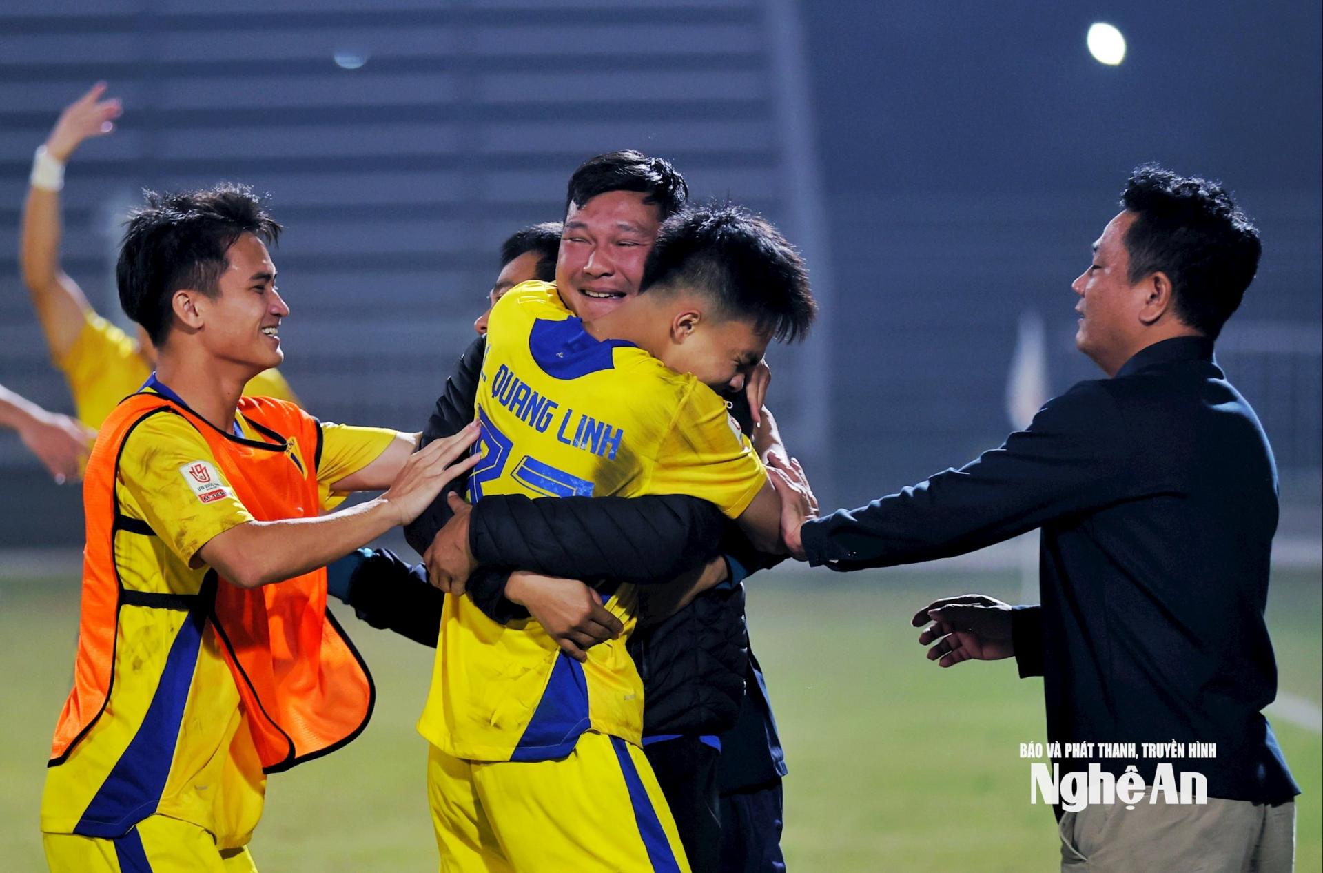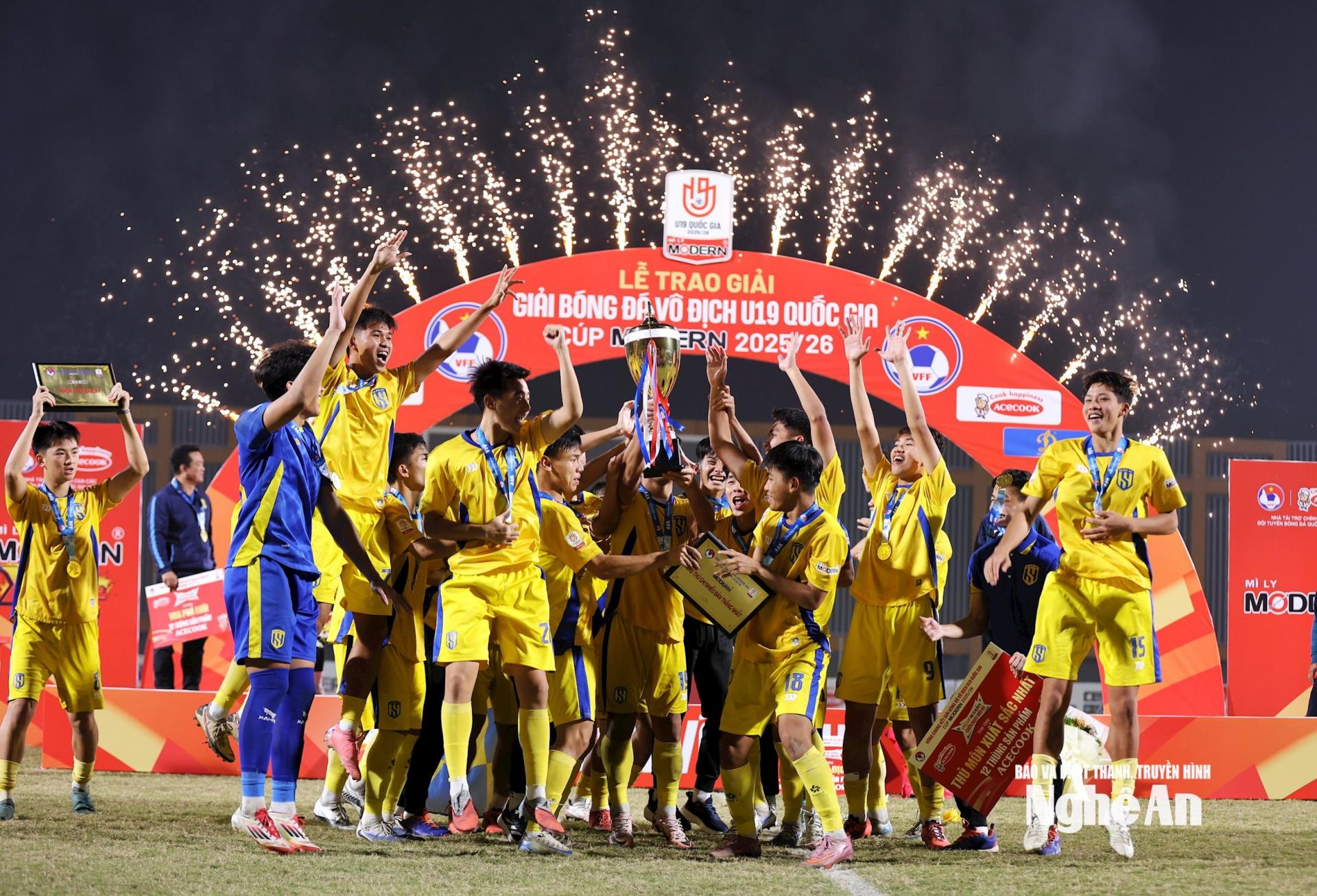 | Chiếc cúp vô địch được giơ cao trong tiếng reo hò, nước mắt, nụ cười và niềm tự hào. Đó là phần thưởng cho hành trình kiên cường và đầy cảm xúc của thầy trò xứ Nghệ. Ảnh: Đức Anh |