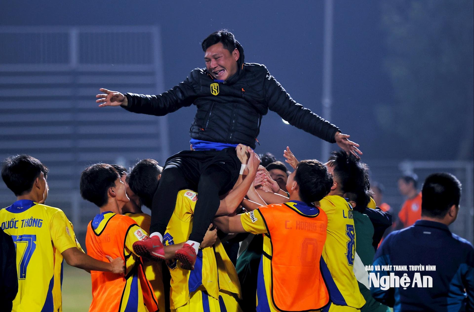 | Trong khoảnh khắc đăng quang, HLV trưởng Nguyễn Hồng Việt được các học trò U19 SLNA tung lên không trung giữa tiếng reo hò chiến thắng. Ảnh: Đức Anh |