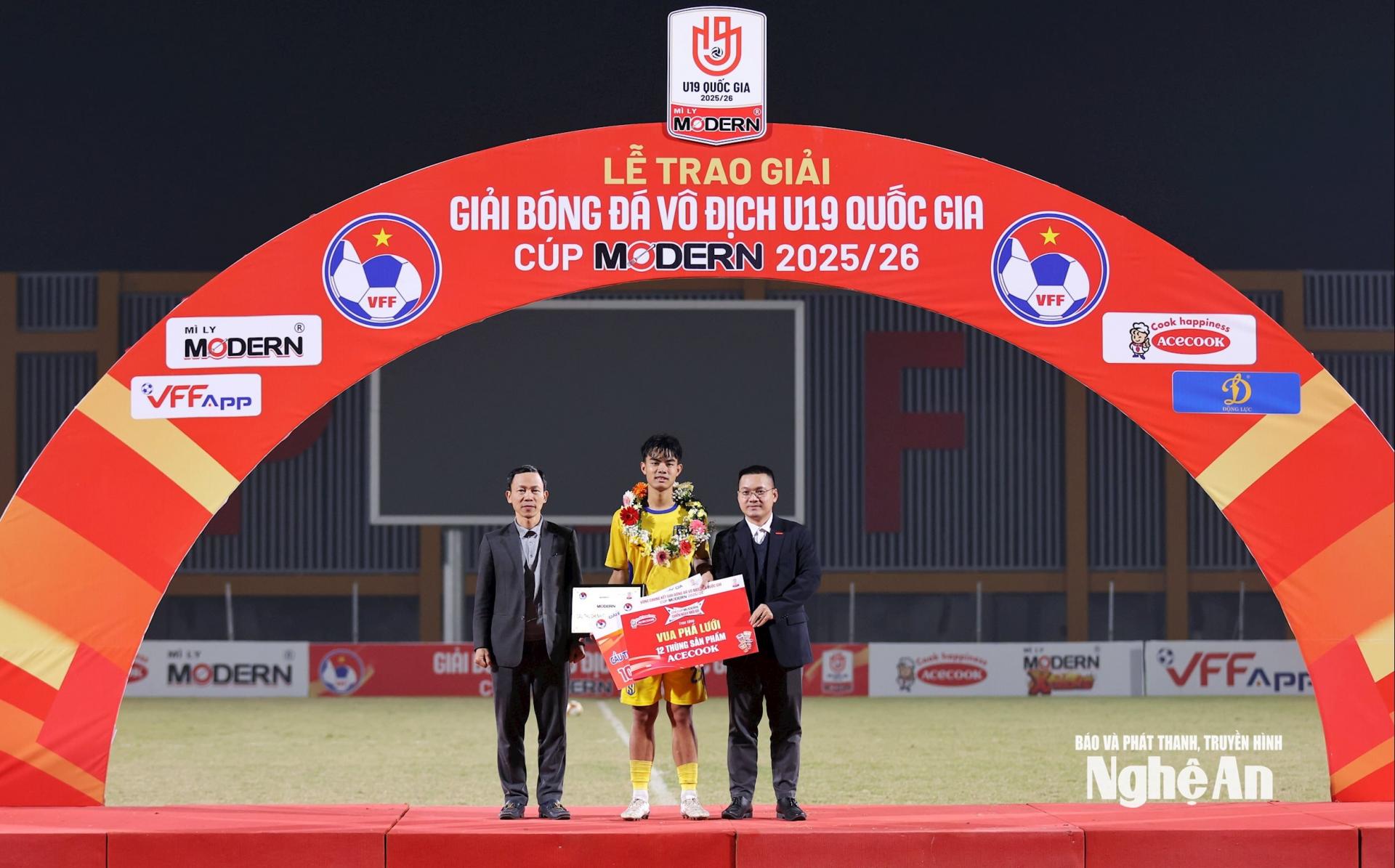 | BTC trao danh hiệu Cầu thủ ghi nhiều bàn thắng nhất cho trung vệ Hoàng Minh Hợi - U19 SLNA. Ảnh: Đức Anh |