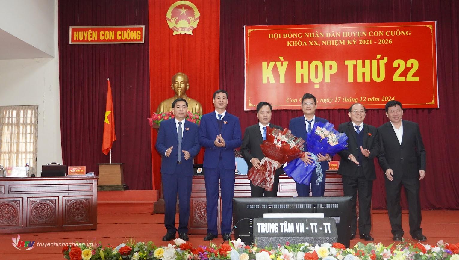 | Đồng chí Nguyễn Như Khôi tặng hoa chúc mừng đồng chí Hồ Sỹ Nguyệt. |
