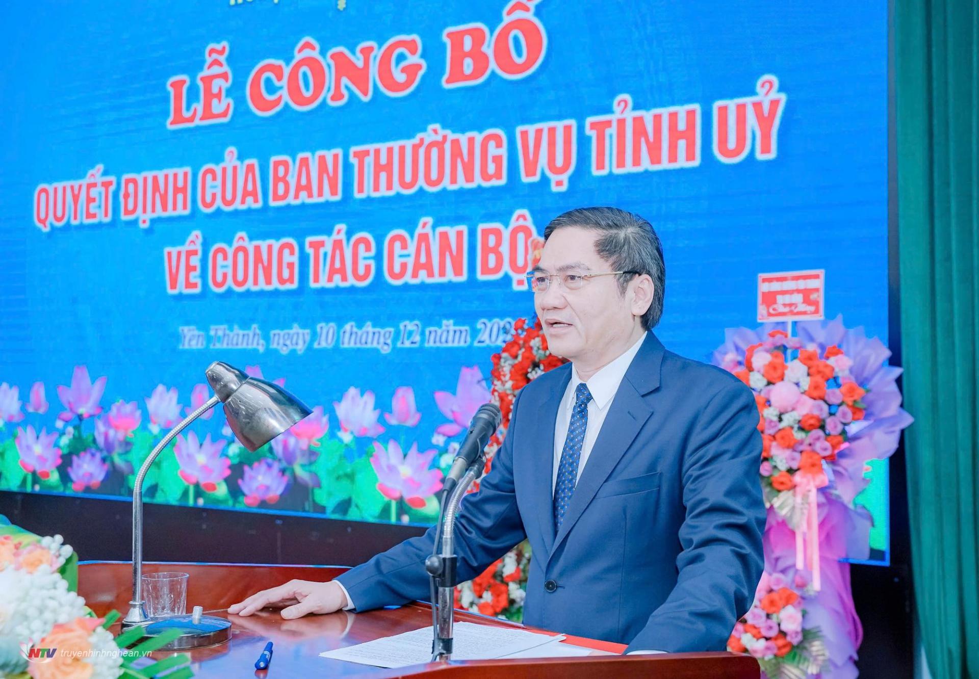| Phó Bí thư Thường trực Tỉnh ủy, Chủ tịch HĐND tỉnh Hoàng Nghĩa Hiếu trao Quyết định và chúc mừng đồng chí Trần Thị Bình, tân Bí thư Huyện ủy Yên Thành. |