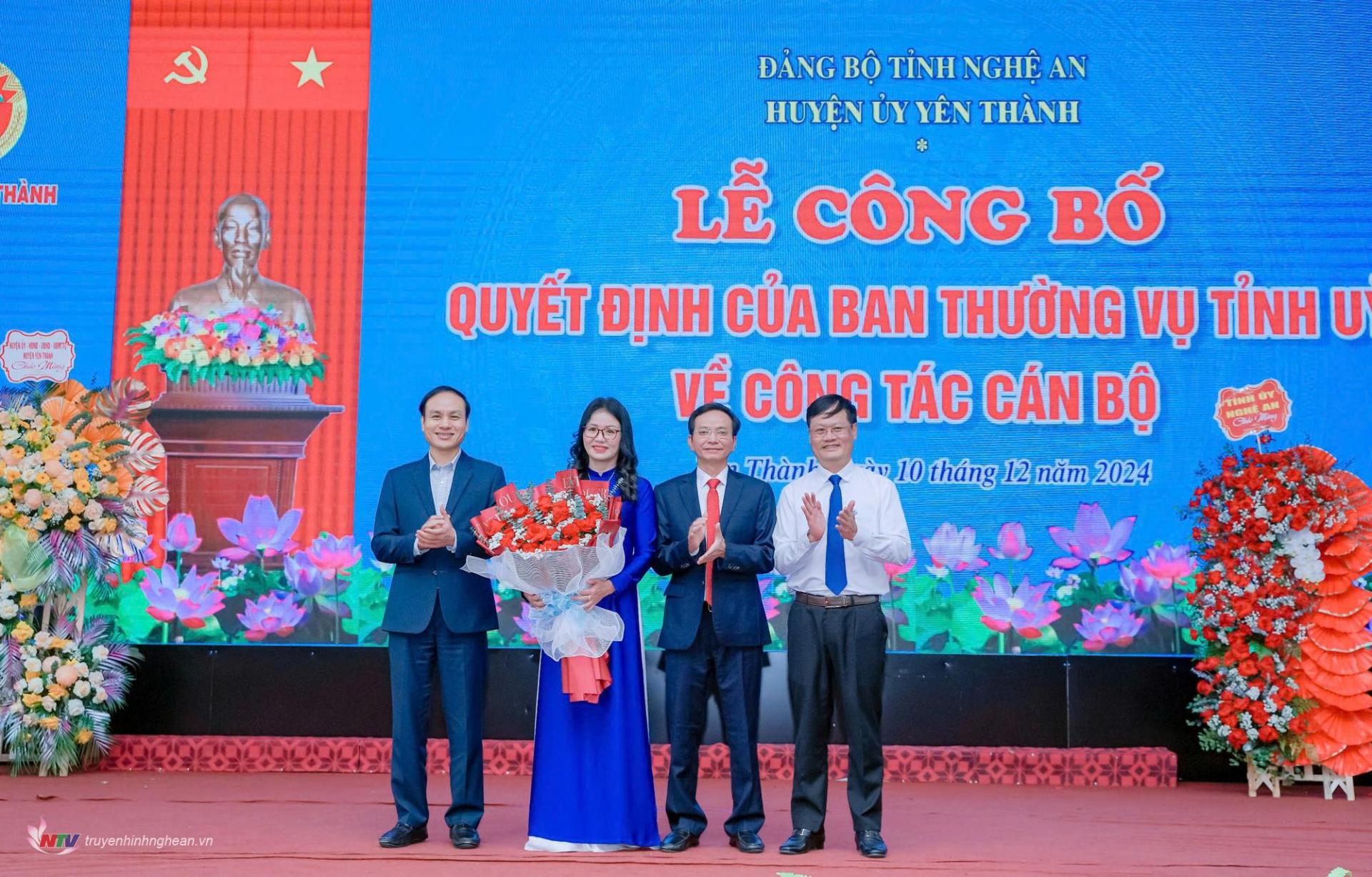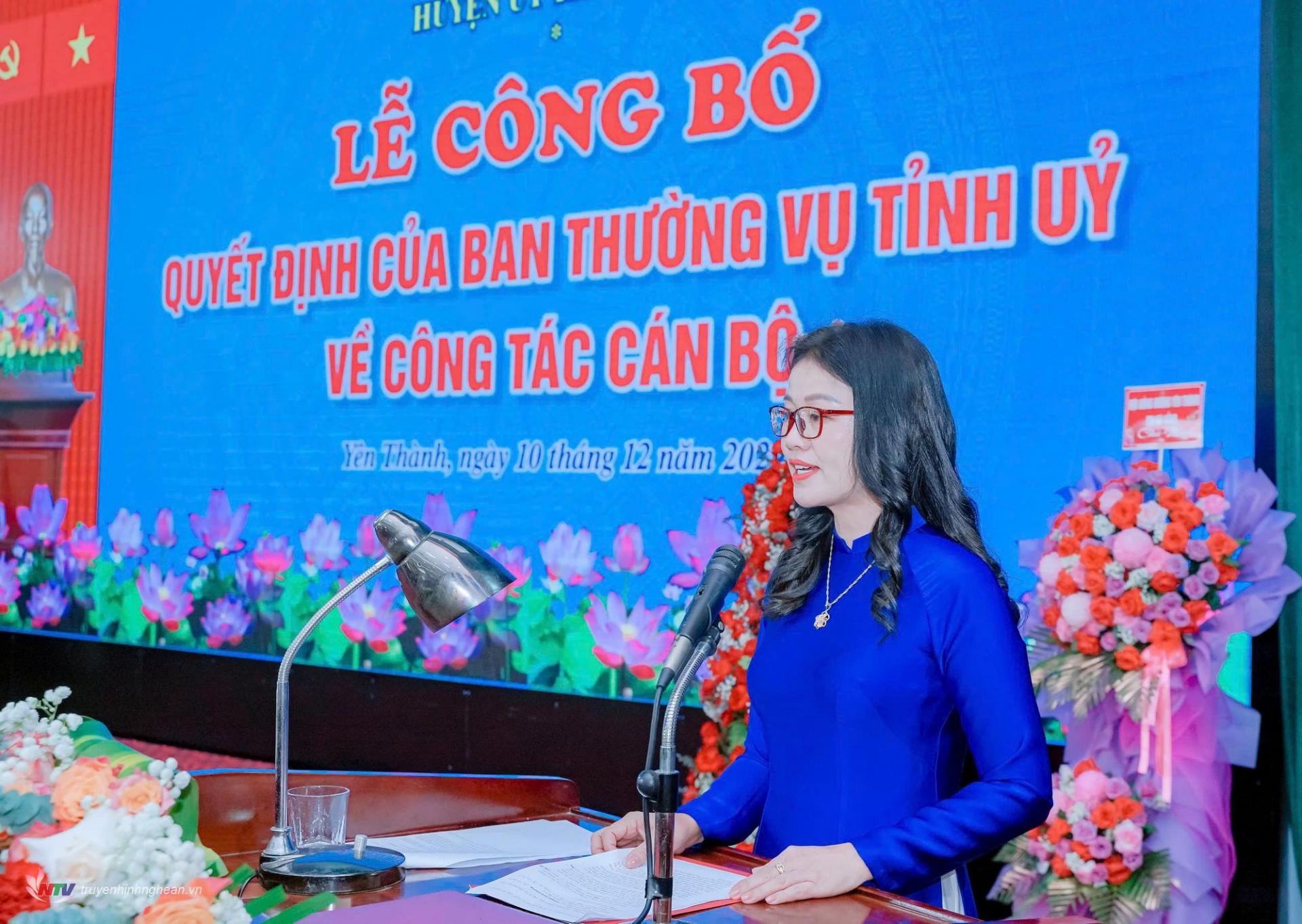 Tại buổi lễ, đại diện Ban tổ chức Tỉnh ủy đã công bố Quyết định số 3016–QĐ/TU ngày 2/12/2024 của Ban thường vụ Tỉnh ủy chuẩn y đồng chí Trần Thị Bình- Phó bí thư Thường trực Huyện ủy, Chủ tịch HĐND huyện Yên Thành giữ chức Bí thư Huyện ủy Yên Thành nhiệm kỳ 2020-2025.