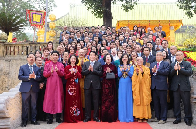 | Chủ tịch Trung ương Mặt trận Tổ quốc Việt Nam Đỗ Văn Chiến chụp ảnh cùng đoàn kiều bào về dự Xuân Quê hương 2025. |