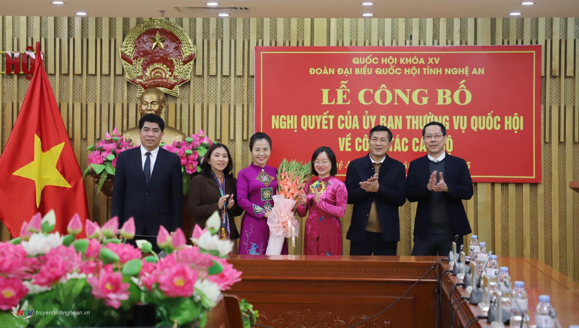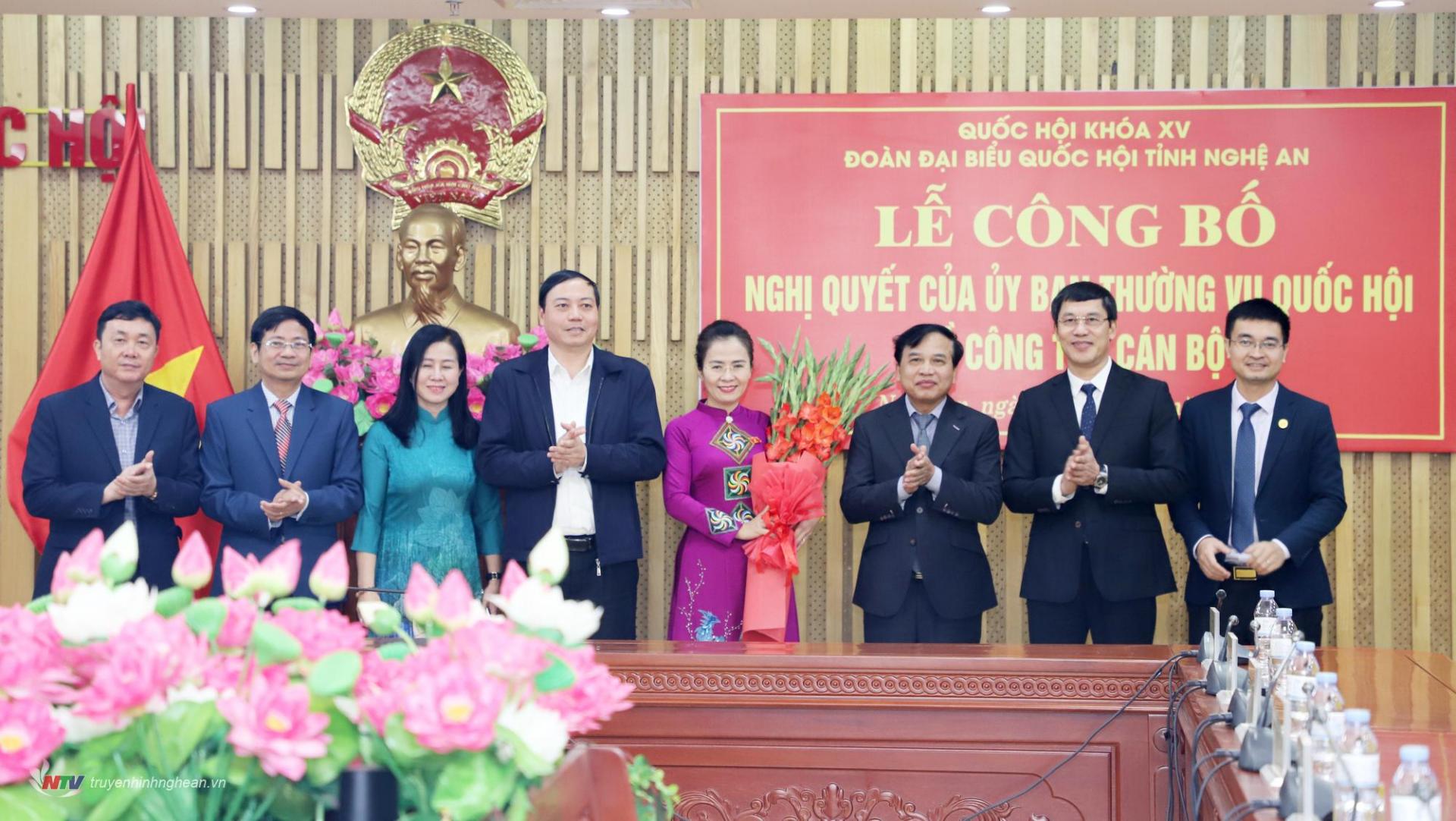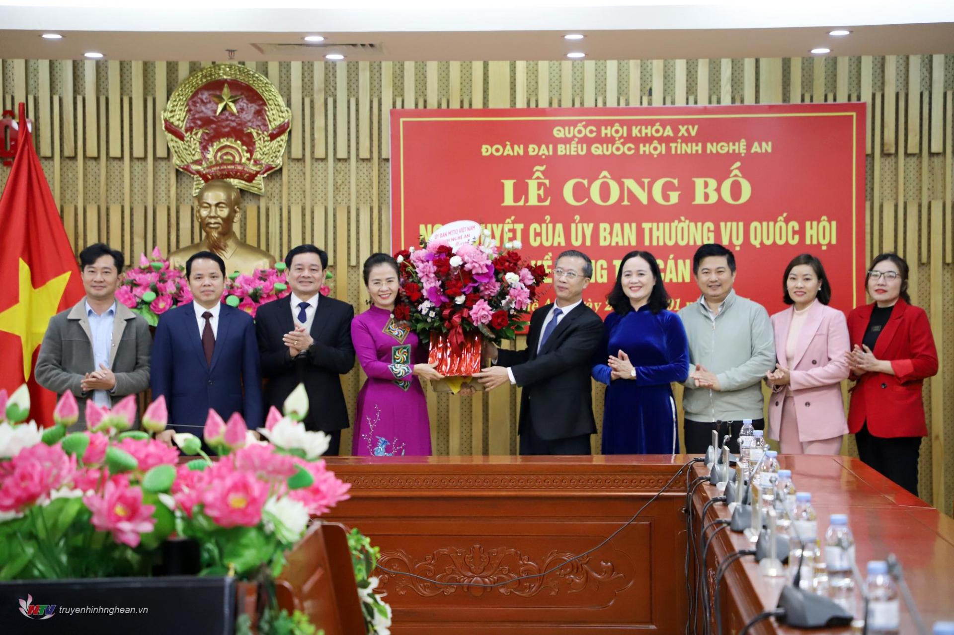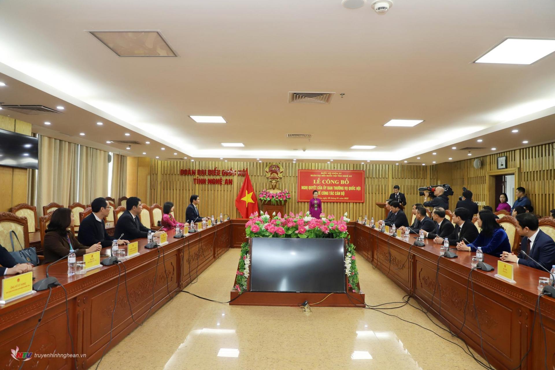 Tại buổi lễ, thừa ủy quyền, Bí thư Tỉnh ủy Nguyễn Đức Trung đã trao Nghị quyết của Ủy ban Thường vụ Quốc hội cho đồng chí Võ Thị Minh Sinh - Ủy viên Ban Thường vụ Tỉnh ủy, Chủ tịch Ủy ban MTTQ Việt Nam tỉnh Nghệ An, Trưởng Đoàn đại biểu Quốc hội khóa XV tỉnh Nghệ An.