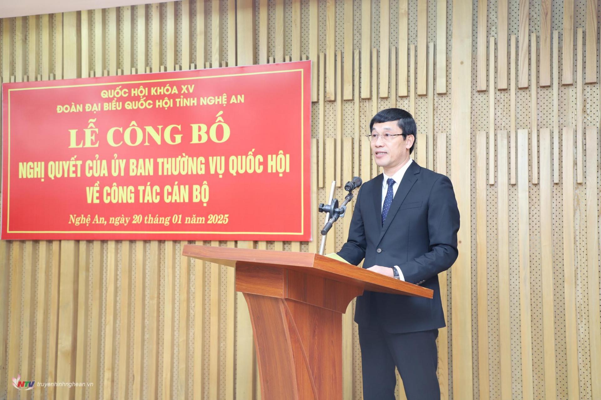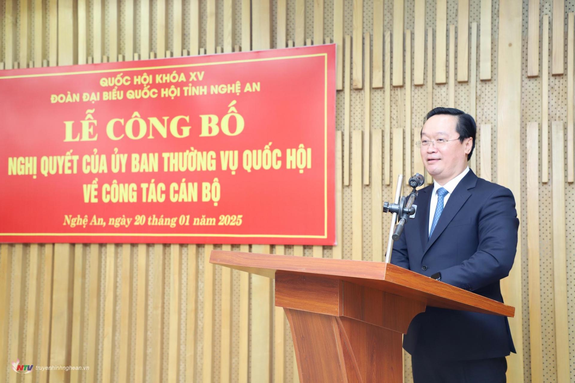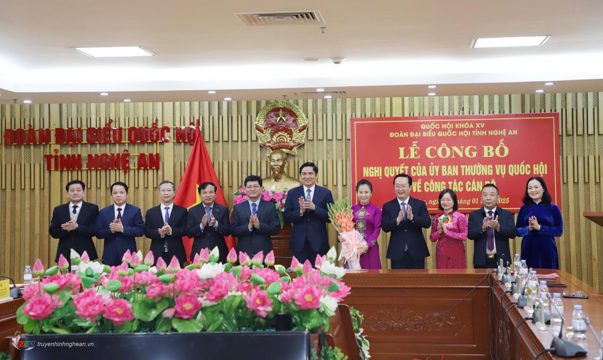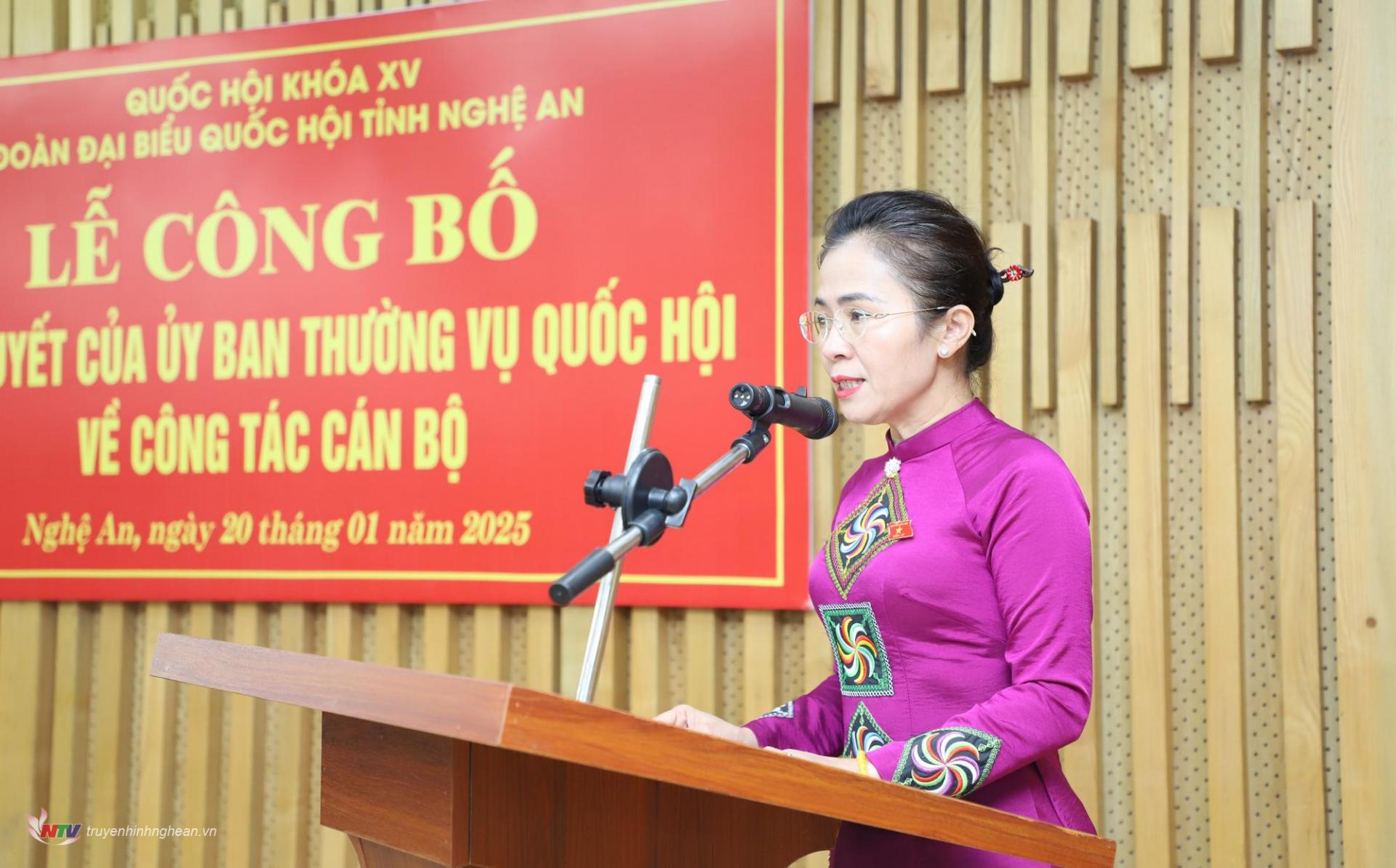 Tại buổi lễ, thừa ủy quyền, Bí thư Tỉnh ủy Nguyễn Đức Trung đã trao Nghị quyết của Ủy ban Thường vụ Quốc hội cho đồng chí Võ Thị Minh Sinh - Ủy viên Ban Thường vụ Tỉnh ủy, Chủ tịch Ủy ban MTTQ Việt Nam tỉnh Nghệ An, Trưởng Đoàn đại biểu Quốc hội khóa XV tỉnh Nghệ An.