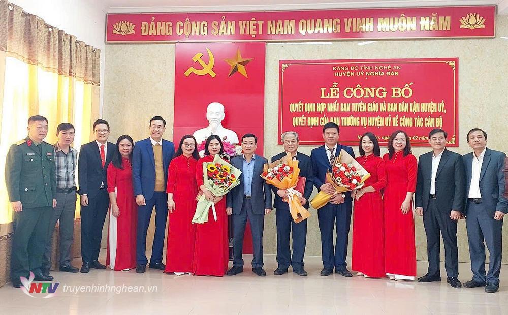 * Cùng ngày, Ban Tổ chức Huyện ủy Nghĩa Đàn cũng đã công bố các quyết định của Ban Thường vụ Huyện ủy về việc hợp nhất Ban Tuyên giáo Huyện ủy và Ban Dân vận Huyện ủy thành Ban Tuyên giáo và Dân vận Huyện ủy; Phân công, bổ nhiệm Trưởng ban, các Phó Trưởng Ban Tuyên giáo và Dân vận Huyện ủy.
