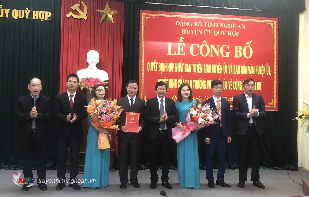 * Sáng 13/2, Ban tổ chức Huyện uỷ Quỳ Hợp công bố Quyết định của Ban Chấp hành Đảng bộ huyện về việc hợp nhất Ban Tuyên giáo Huyện ủy và Ban Dân vận Huyện ủy thành Ban Tuyên giáo và Dân vận Huyện ủy Quỳ Hợp; Công bố Quyết định phân công đồng chí Trần Văn Tuấn, Uỷ viên Ban thường vụ, giữ chức Trưởng Ban tuyên giáo và Dân vận huyện uỷ, Giám đốc Trung tâm Chính trị huyện Quỳ Hợp; Công bố Quyết định bổ nhiệm đồng chí Vi Thị Hoa, Phó trưởng ban tuyên giáo huyện uỷ và đồng chí Nguyễn Thị Thu Hà, Phó trưởng Ban Dân vận huyện uỷ giữ chức vụ Phó Trưởng ban Ban Tuyên giáo và Dân vận Huyện ủy Quỳ Hợp.