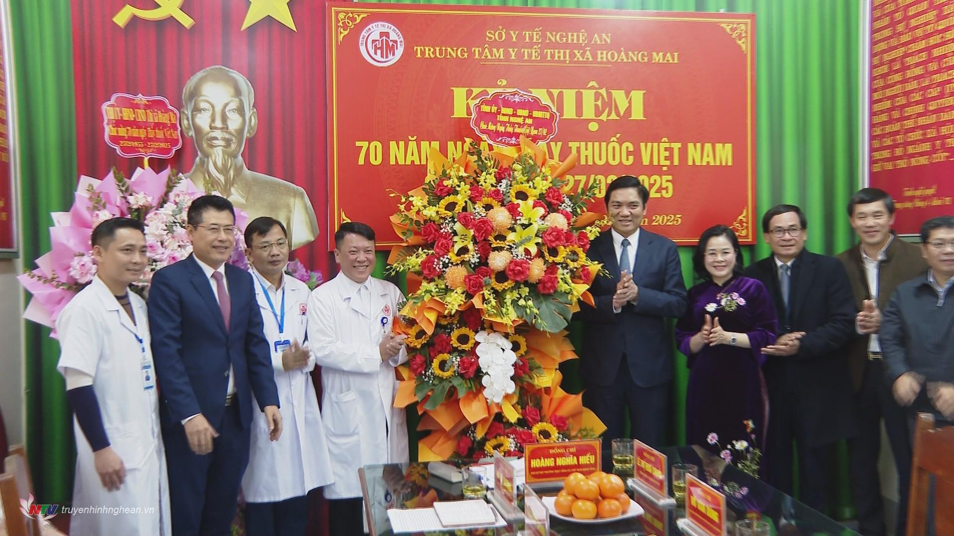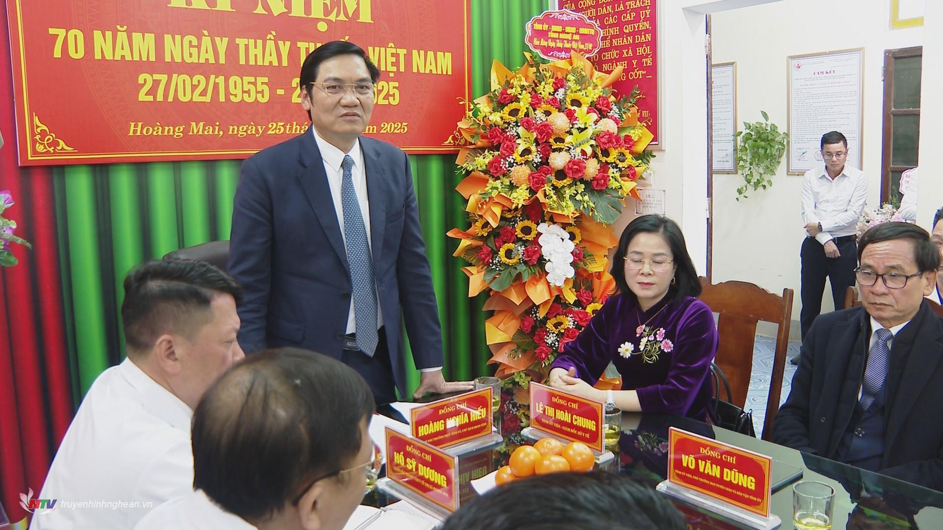 | Phó Bí thư Thường trực Tỉnh ủy, Chủ tịch HĐND tỉnh và đoàn công tác tặng hoa, chúc mừng Trung tâm Y tế Hoàng Mai. |