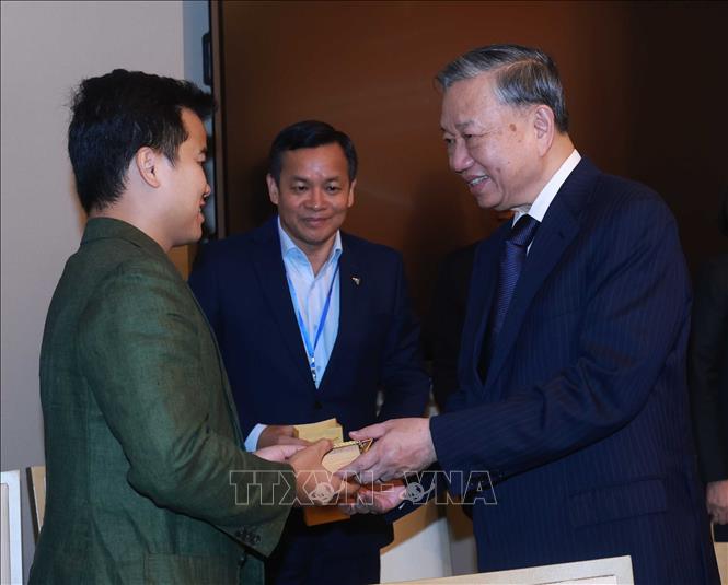 | Tổng Bí thư Tô Lâm tặng quà lưu niệm cho các đại biểu. (Ảnh: TTXVN) |