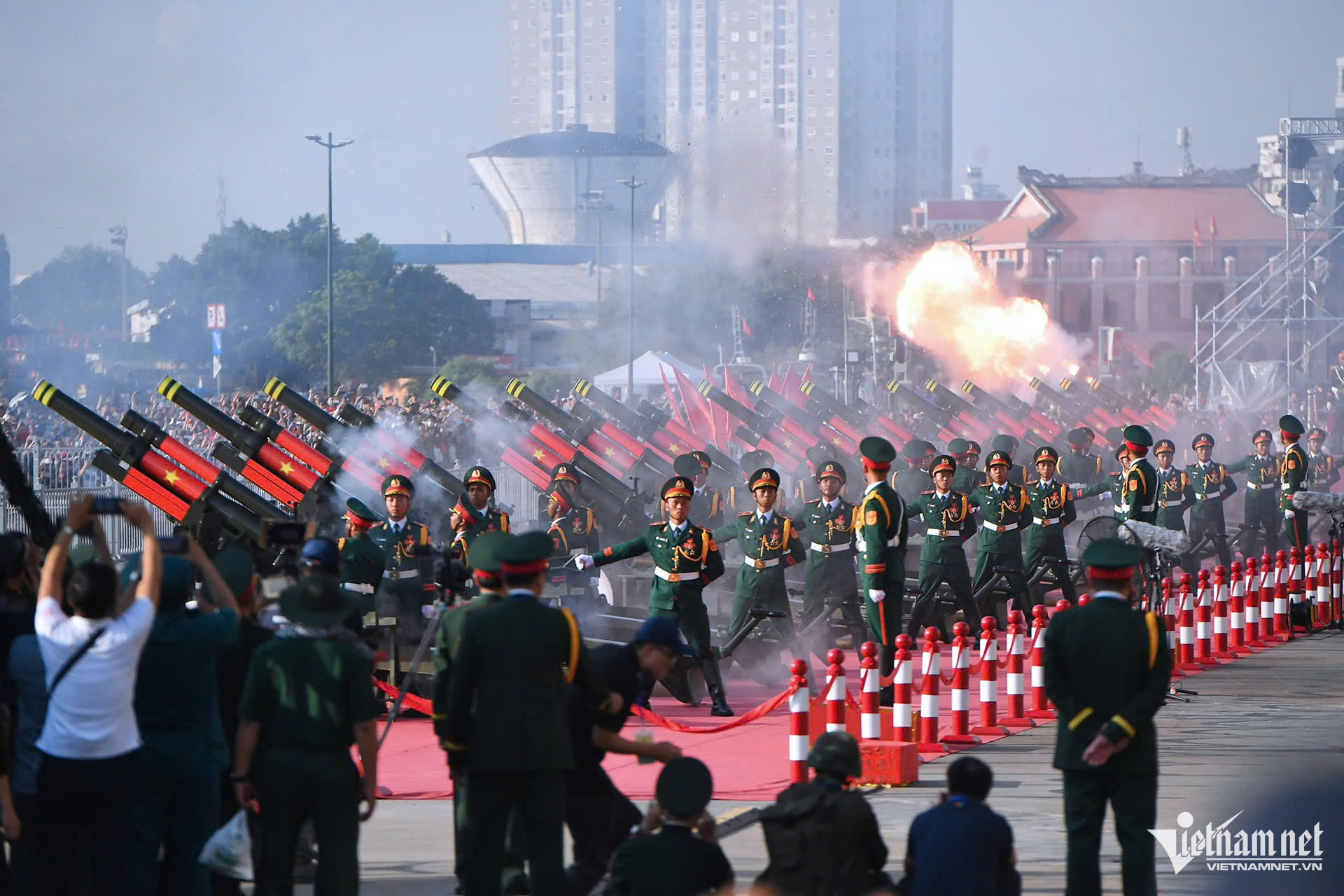 | Tiếp đến là phần lễ với lễ chào cờ cùng thời khắc này, đội pháo lễ (tại bờ sông Bến Bạch Đằng) đồng loạt bắn 21 phát đại bác trên nền bài Quốc ca. |