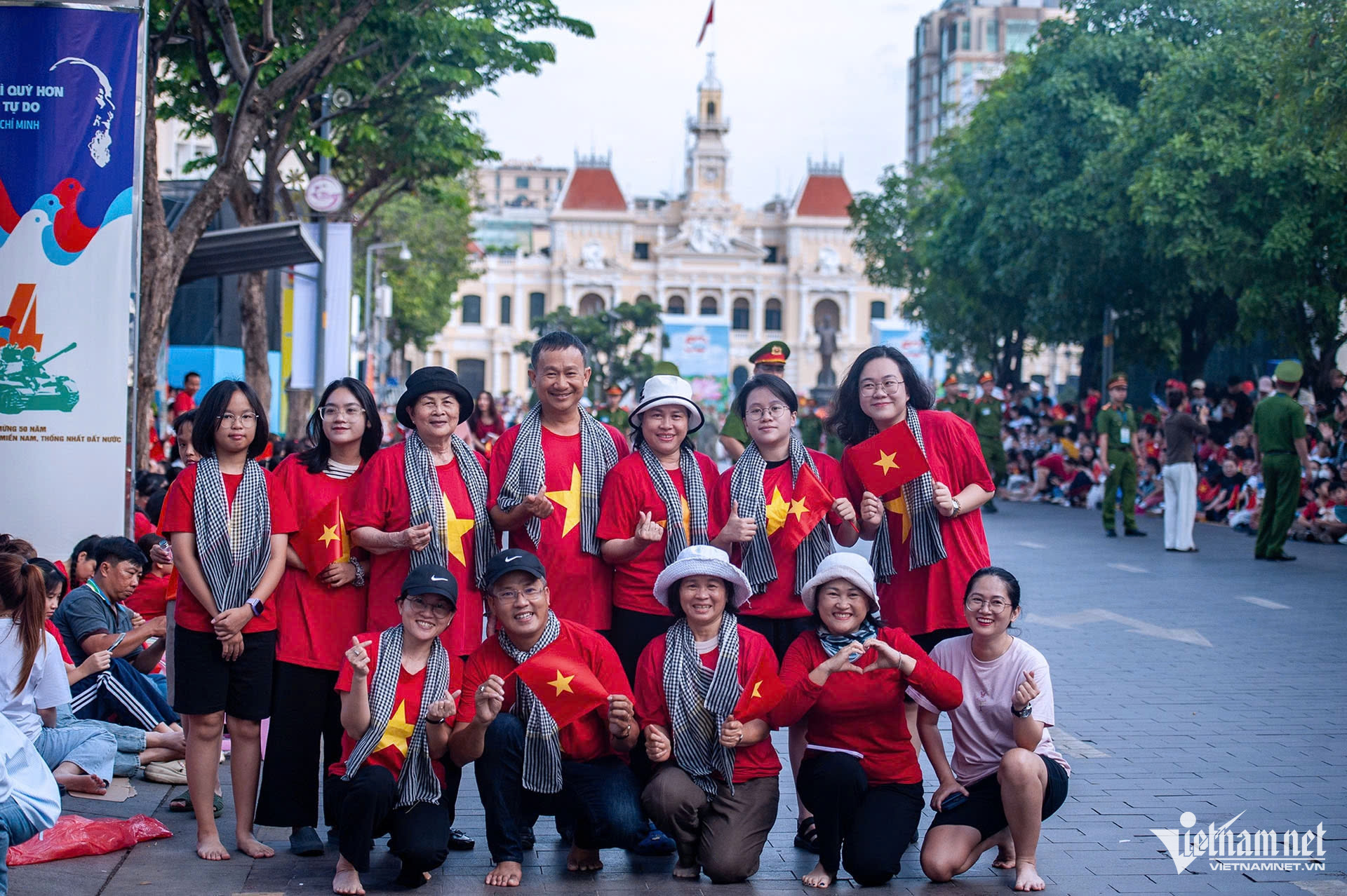 | Gia đình bà Phan Nữ Lệ Tuyết đến từ Bình Thuận đã có mặt tại phố đi bộ Nguyễn Huệ từ đêm trước để chờ xem tổng duyệt lễ diễu binh, diễu hành. Mặc dù trải qua một đêm nghỉ ngơi trên phố, bà và các thành viên trong gia đình vẫn giữ trọn vẹn sự hồ hởi, tranh thủ ghi lại những khoảnh khắc đáng nhớ trước giờ sự kiện trọng đại diễn ra. |