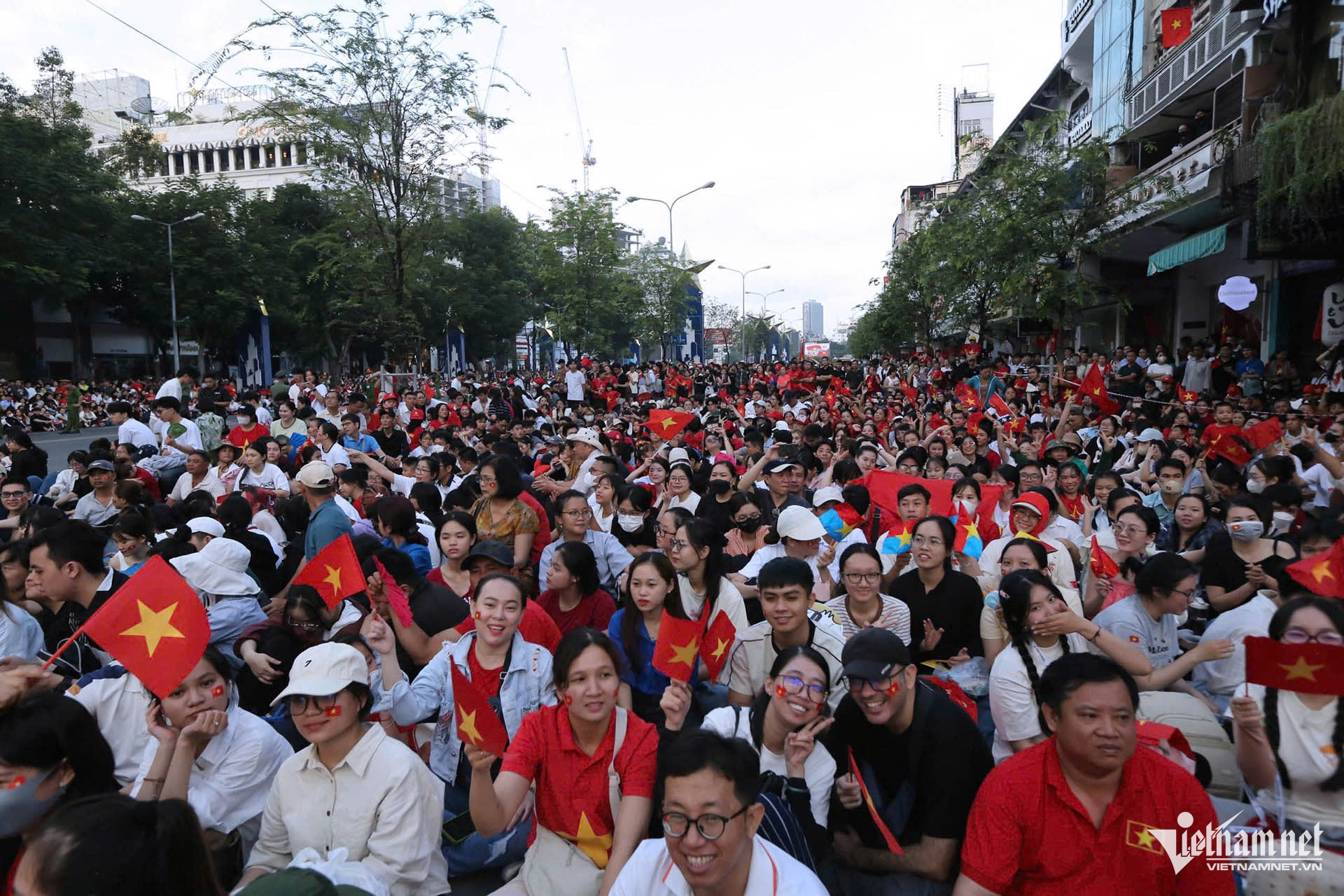 | Ngã tư Nguyễn Đình Chiểu - Hai Bà Trưng, rất đông nhân dân ngồi dưới đường chờ đoàn diễu binh đi qua |