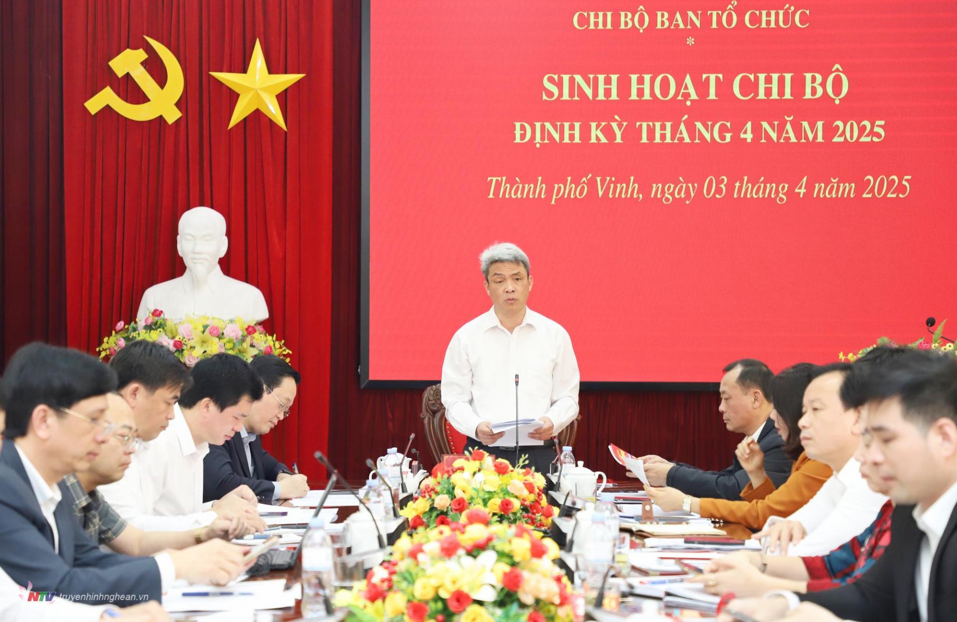 Bí thư Tỉnh uỷ Nguyễn Đức Trung đề nghị chi bộ cơ quan tham mưu quan trọng như Ban Tổ chức Thành uỷ Vinh phải phối hợp chặt chẽ với các Ban xây dựng Đảng để triển khai nhiệm vụ. Việc đầu tiên phải quan tâm đến công tác chính trị tư tưởng để đội ngũ cán bộ, đảng viên yên tâm, vững vàng tiếp tục thực hiện tốt nhiệm vụ; tạo nên sự đồng thuận, đoàn kết, thống nhất cao trong từng tổ chức Đảng để cùng thực hiện nhiệm vụ, đặc biệt là công tác sắp xếp tổ chức bộ máy trong thời gian tới.