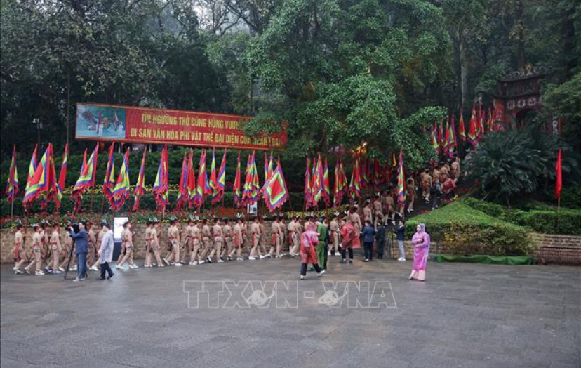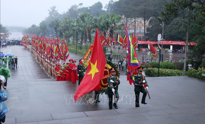 Đi đầu đoàn hành lễ là các chiến sĩ Quân đội nhân dân Việt Nam rước Quốc kỳ, cờ hội và vòng hoa mang dòng chữ "Đời đời nhớ ơn các Vua Hùng đã có công dựng nước". Theo sau là các thiếu nữ mặc áo dài đỏ mang hương, hoa, lễ vật và 100 con cháu Lạc Hồng trong trang phục cổ, tay giương cao cờ hội, thể hiện sức sống mãnh liệt của dòng giống Tiên Rồng cùng đoàn rước kiệu dâng lễ vật hương, hoa, bánh chưng, bánh giầy gắn liền với truyền thuyết về vị hoàng tử Lang Liêu.