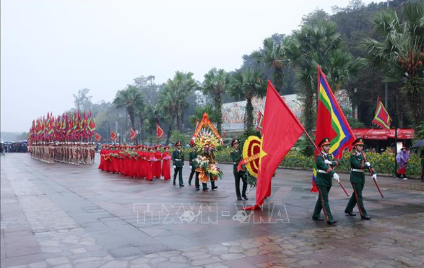Tiếp đó, Chủ tịch nước Lương Cường cùng các đồng chí lãnh đạo Đảng, Nhà nước đặt vòng hoa, thắp hương tại Lăng Hùng Vương; dâng hoa tại Bức phù điêu Bác Hồ nói chuyện với cán bộ, chiến sĩ Đại đoàn quân Tiên Phong tại Ngã năm Đền Giếng.