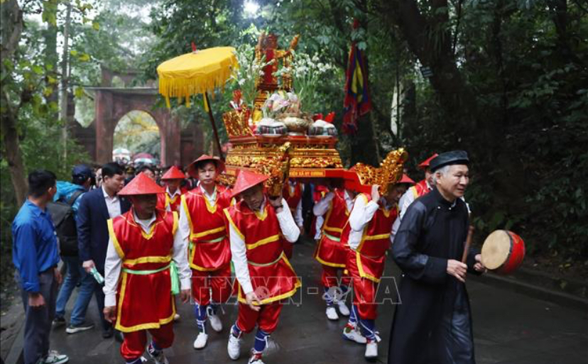 | Đoàn dâng hương khởi hành lên núi Nghĩa Lĩnh. Ảnh: TTXVN |