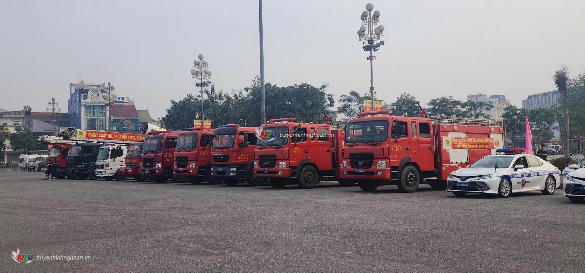 | Dàn xe PCCC đồng loạt lăn bánh trong lễ diễu hành, thể hiện tinh thần sẵn sàng chiến đấu với “giặc lửa”. |