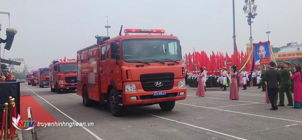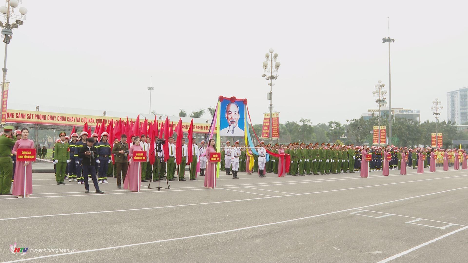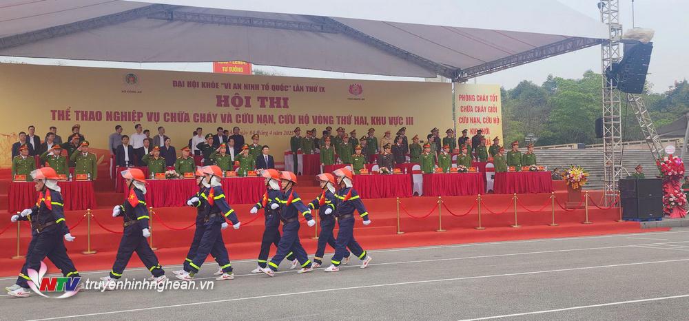 | Lực lượng Cảnh sát phòng cháy, chữa cháy và cứu nạn, cứu hộ các tỉnh thành diễu hành trang nghiêm trong lễ khai mạc. |