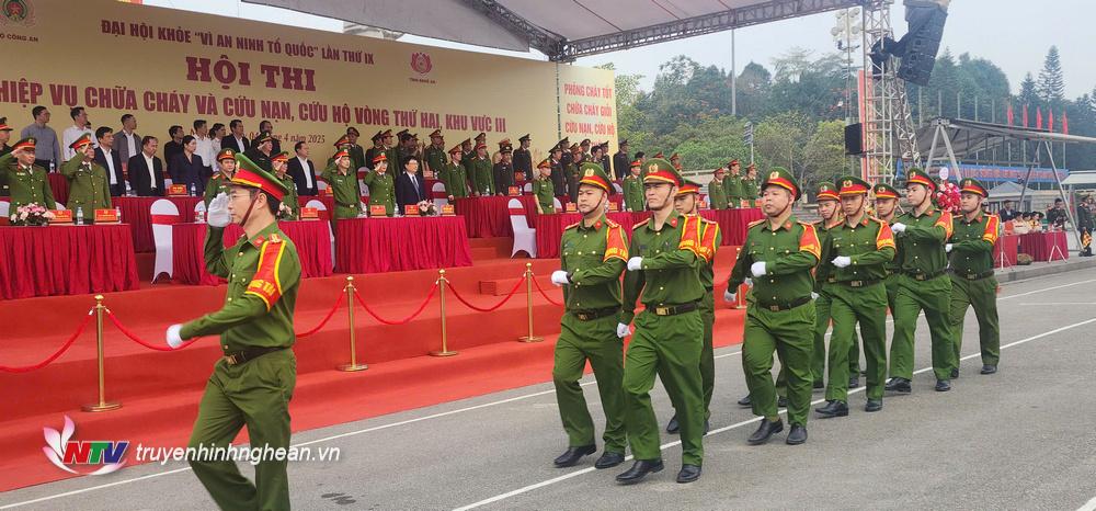 | 13 đội tuyển đại diện Công an các tỉnh, thành phố khu vực III tham gia lễ khai mạc hội thi năm 2025 tại Nghệ An. |