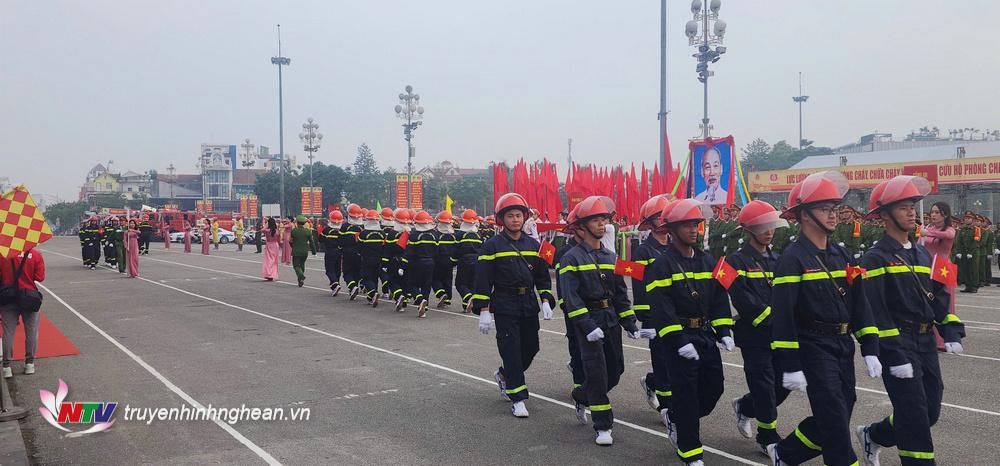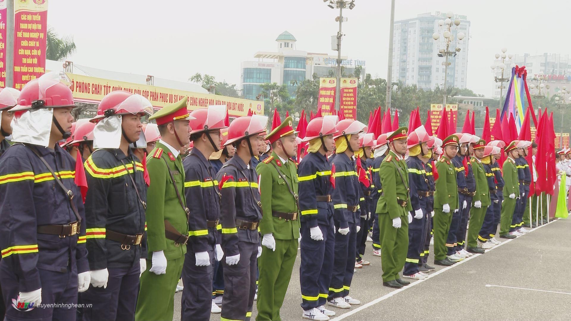 | Lực lượng Cảnh sát phòng cháy, chữa cháy và cứu nạn, cứu hộ các tỉnh thành diễu hành trang nghiêm trong lễ khai mạc. |