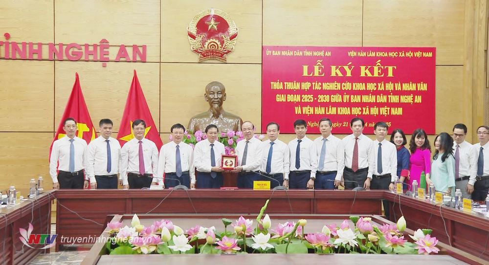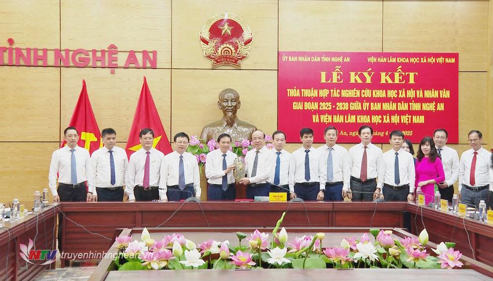 | Lãnh đạo Viện Hàn lâm Khoa học Xã hội Việt Nam trao tặng món quà lưu niệm đến lãnh đạo tỉnh Nghệ An. |