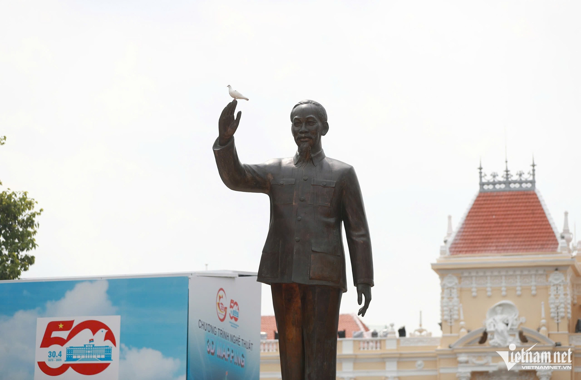 | Tượng đài Chủ tịch Hồ Chí Minh trước trụ sở UBND TPHCM. Khi đoàn đại biểu lãnh đạo, nguyên lãnh đạo Đảng, Nhà nước tới dâng hương, dâng hoa thì một chú chim bồ câu đã đậu lên tay bức tượng |