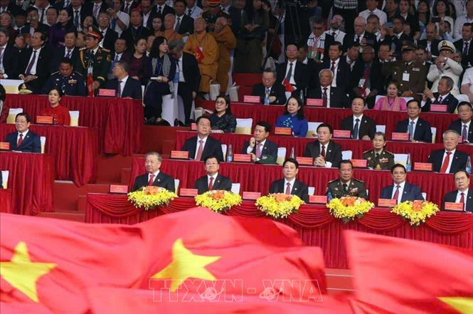 | Tổng Bí thư Tô Lâm và các đồng chí Lãnh đạo, nguyên Lãnh đạo Đảng, Nhà nước cùng các vị khách quốc tế và đại biểu dự buổi lễ - Ảnh: VGP/Nhật Bắc |